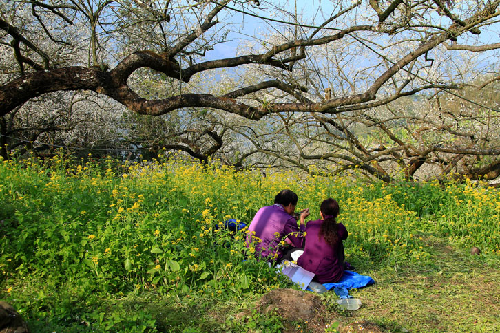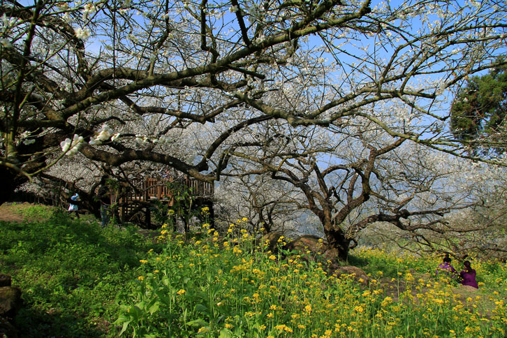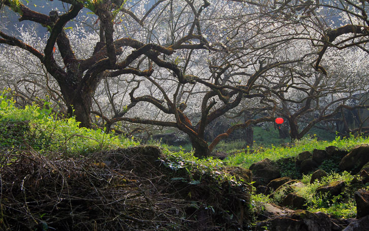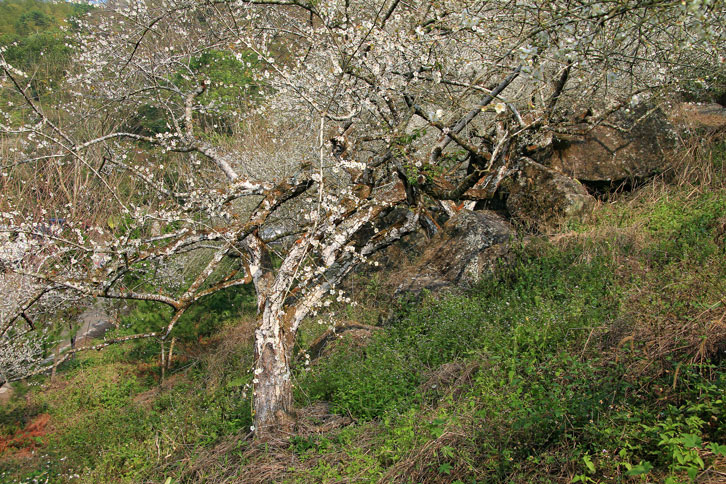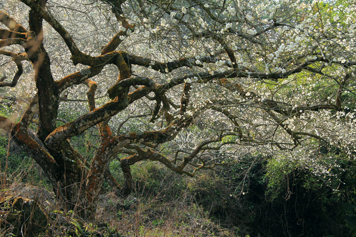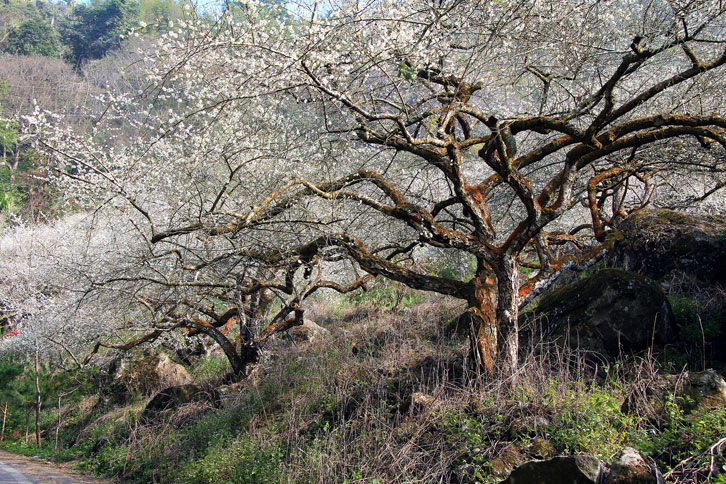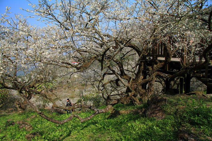 盛開的梅花有如瑞雪般,覆蓋了整個山頭,梅雪隨風飄落,浪漫迷
