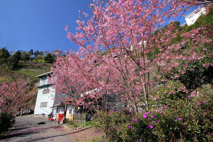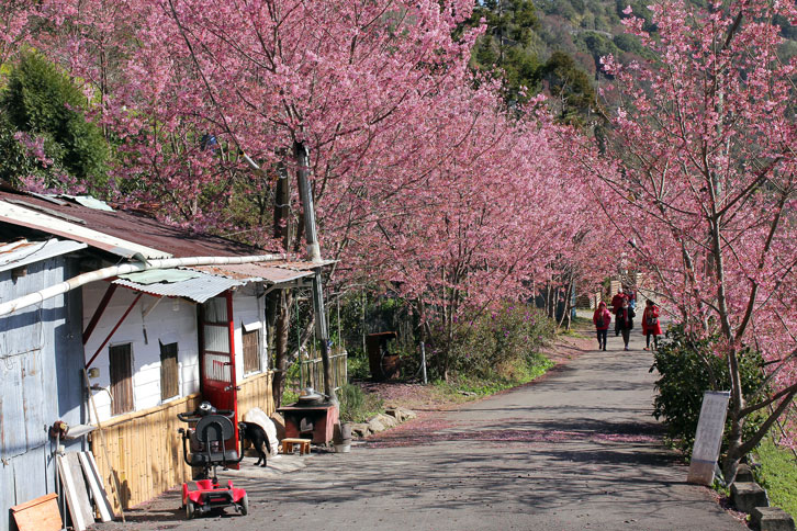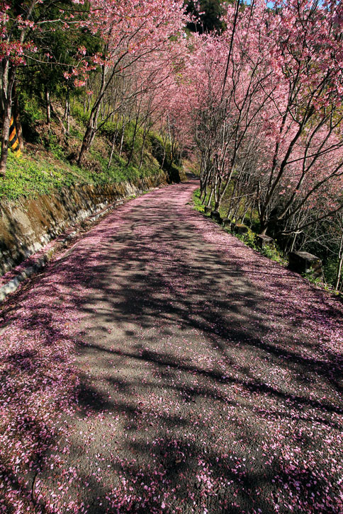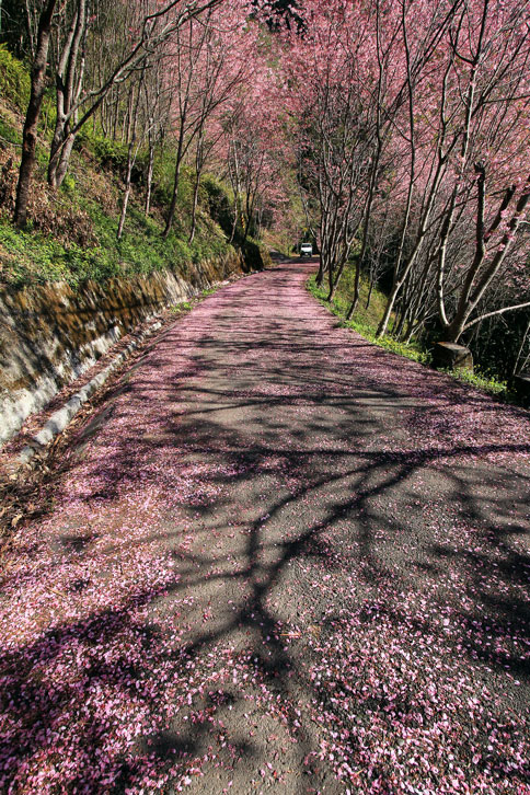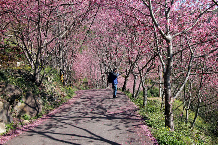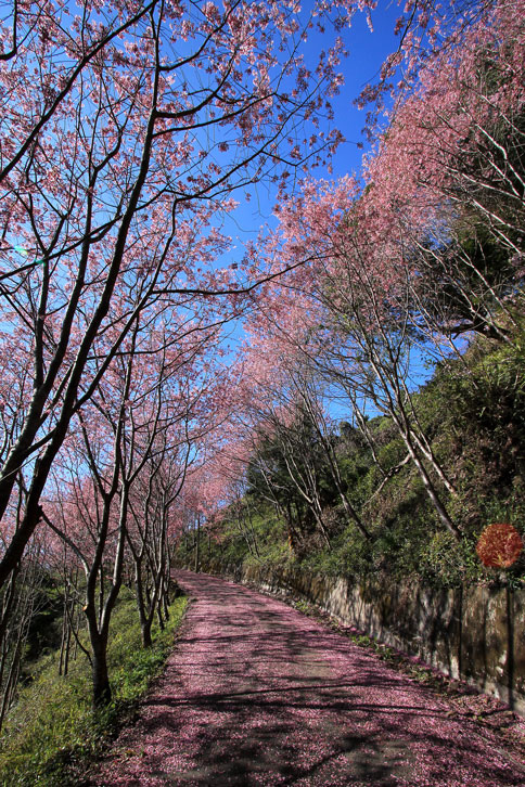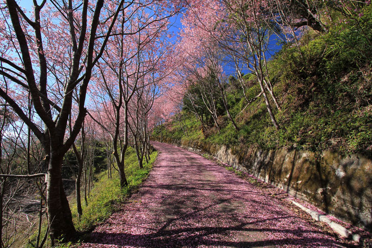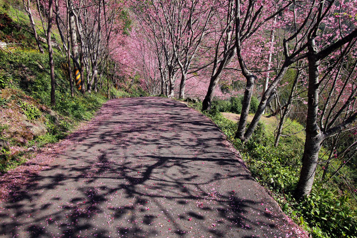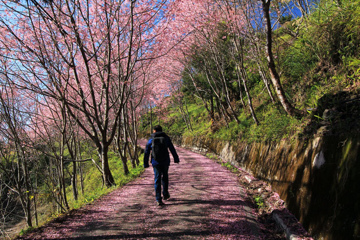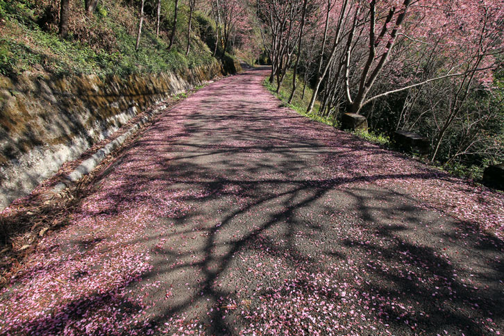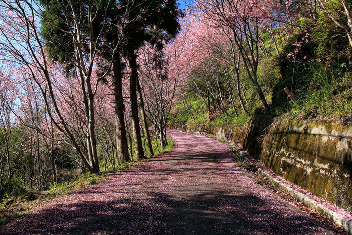 中巴陵教會附近,交織出300公尺的「櫻木花道」,淡粉花瓣隨風飄搖