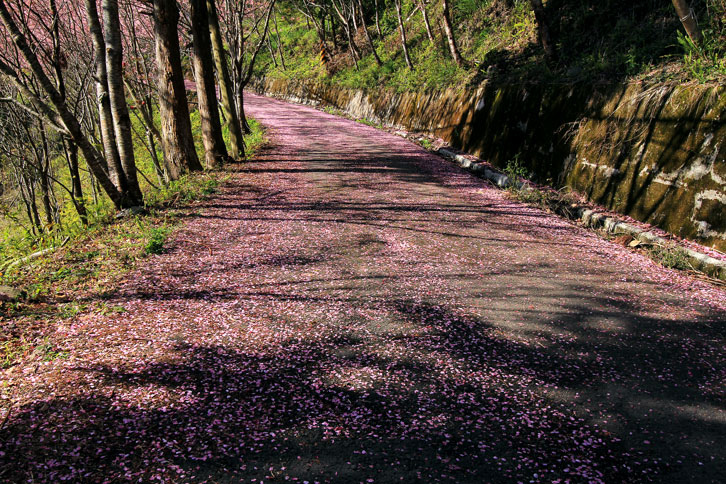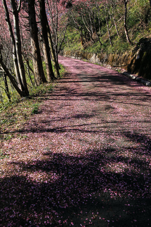 ,落花鋪成的粉紅花毯令人不忍踩踏。