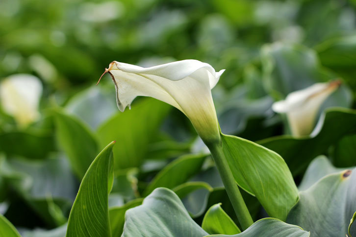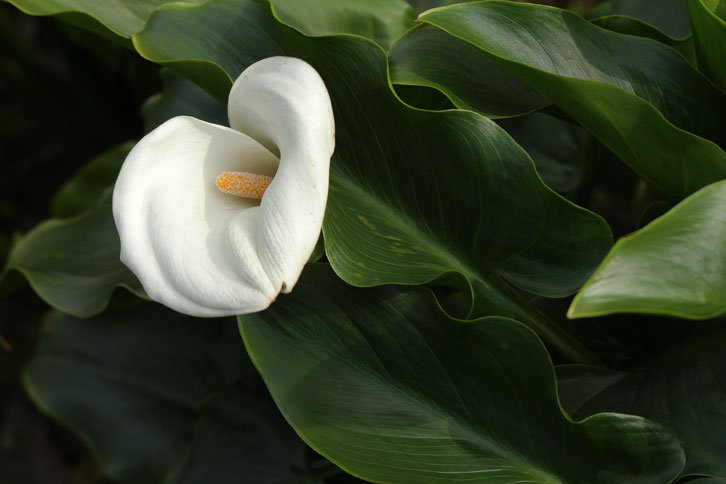種葉面有白色或黃色斑點。觀賞部分是呈捲漏斗狀美麗的花苞片,