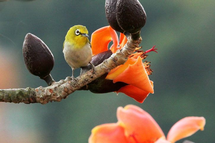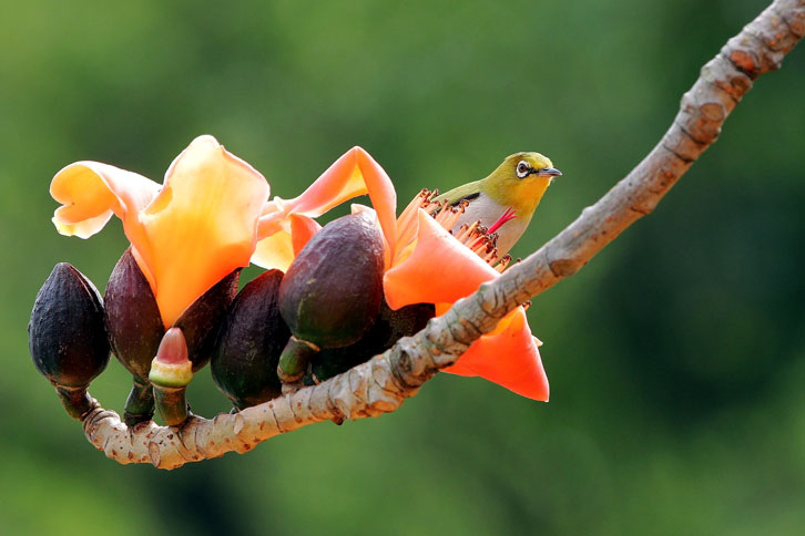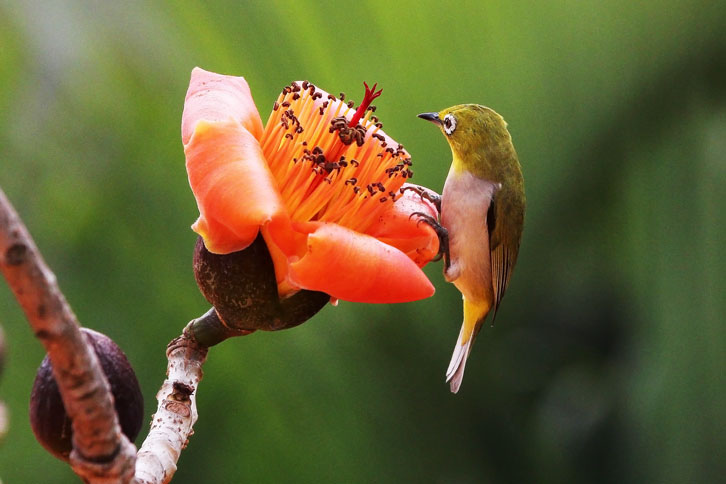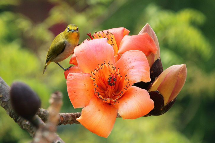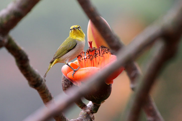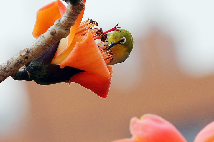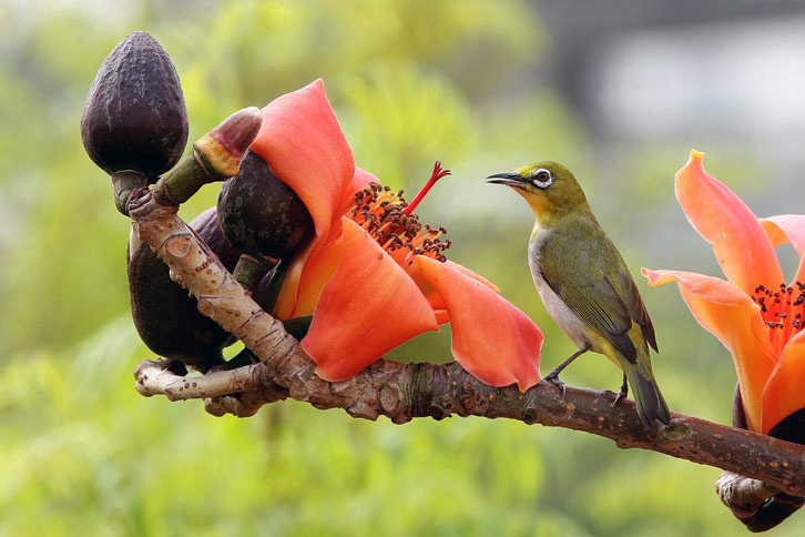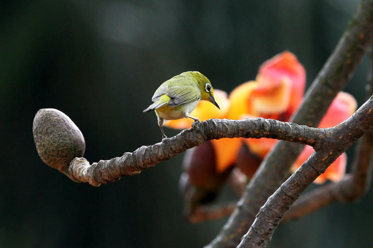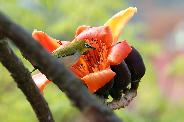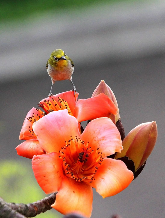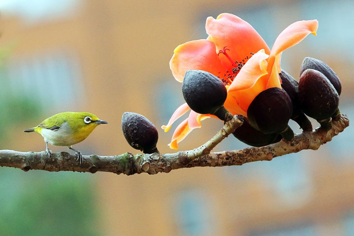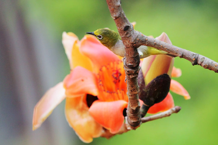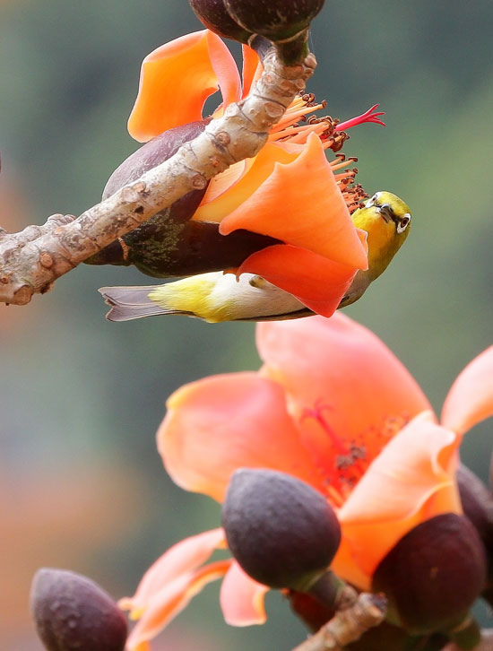 綠繡眼乘著春風的翅膀,飛向有愛的地方;吸吮著初春的滋露,纏綿在木棉的懷抱裡。