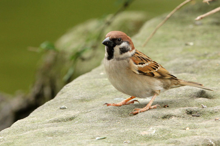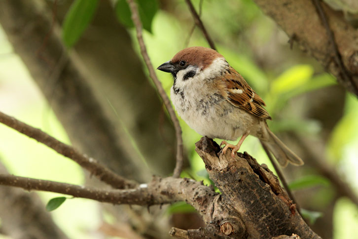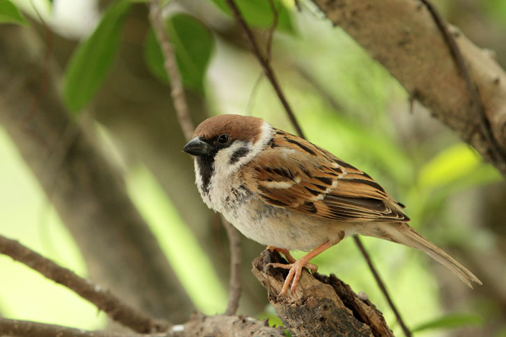 ,頰有黑斑甚為醒目。腮、喉中央黑色,胸以下污白色。麻雀體形
