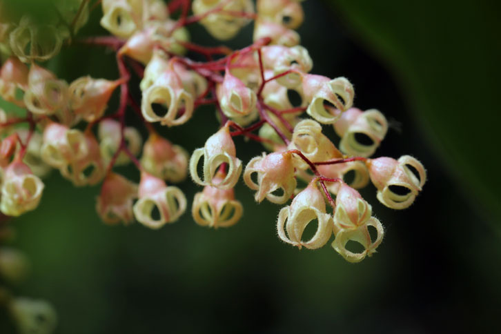萼沒有花瓣,花萼呈深裂瓣狀,通常5瓣,奶黃色,花開時