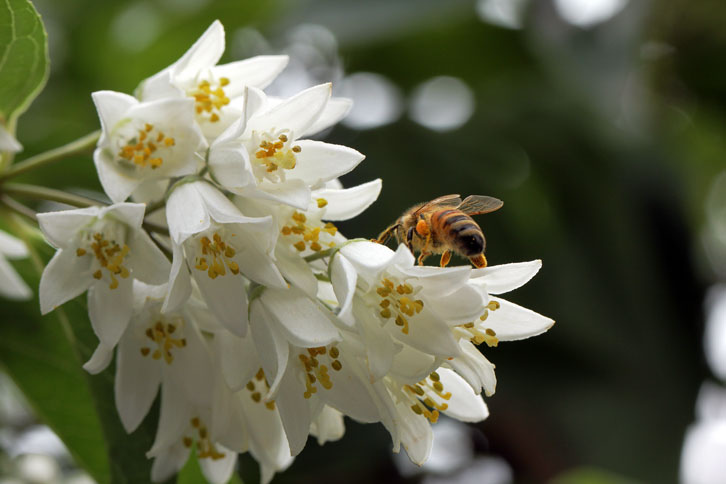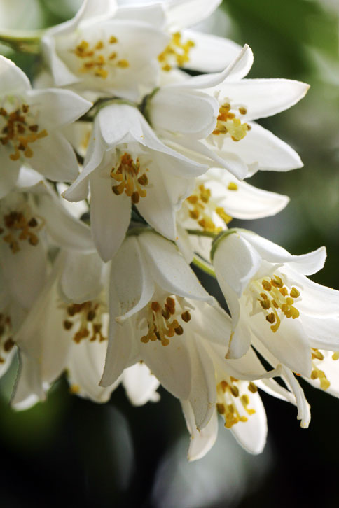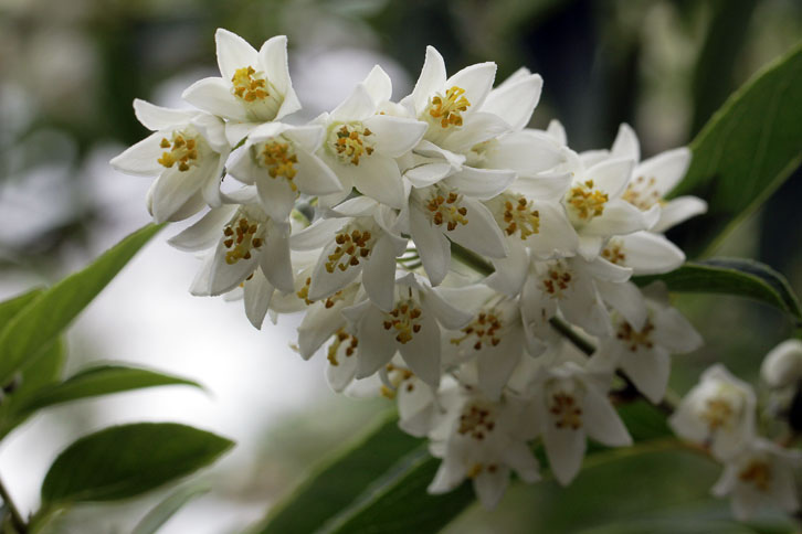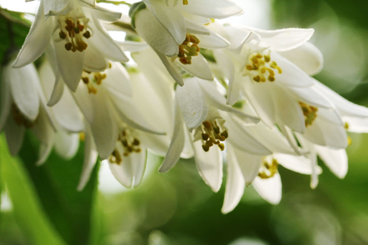 春至初夏開花,圓錐花序頂生,花冠白色,五瓣,花姿潔