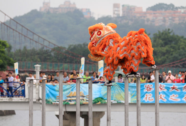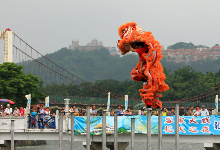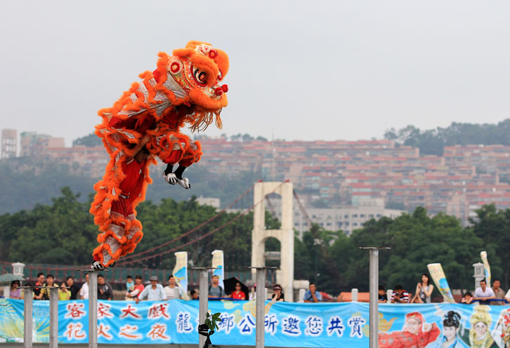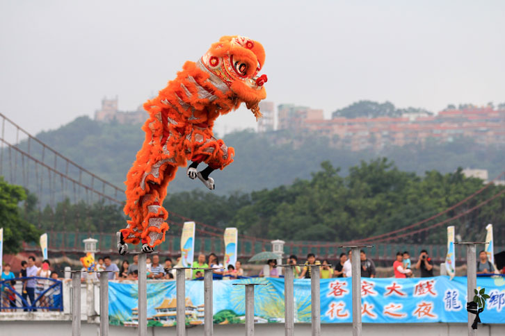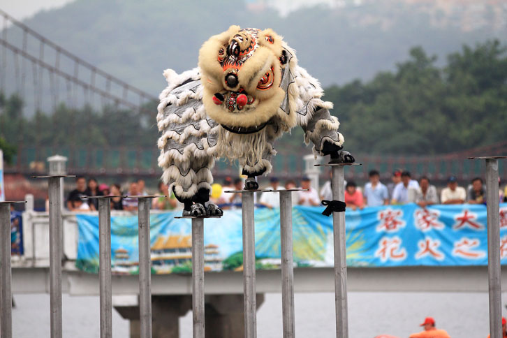 跳樁演出過程中,驚險萬分。獅子會表現出各種神態與高難
