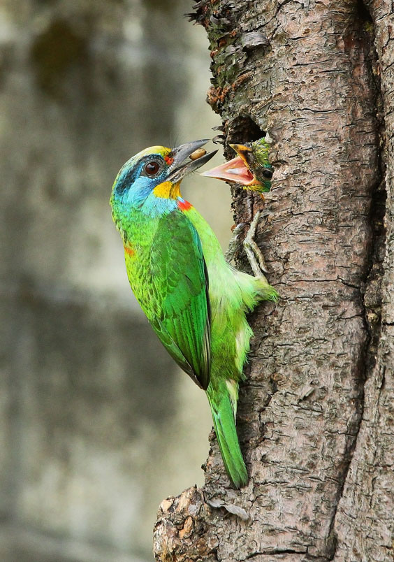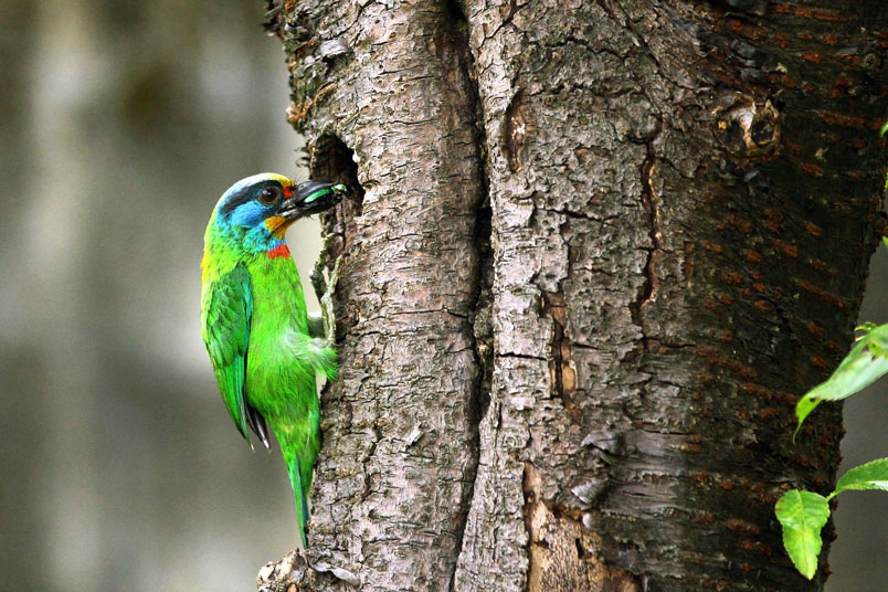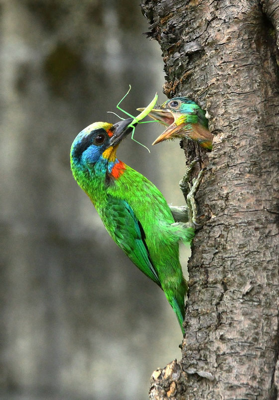 五色鳥是雜食性,所以會看到叼著蟲、螳螂或是漿果回來餵雛鳥,
