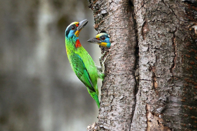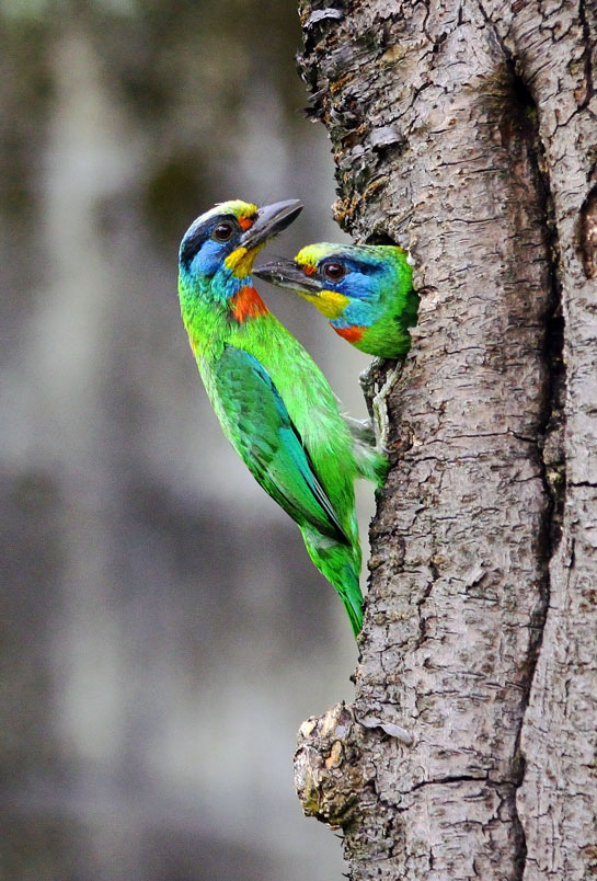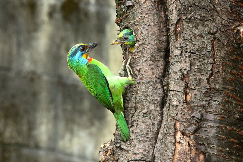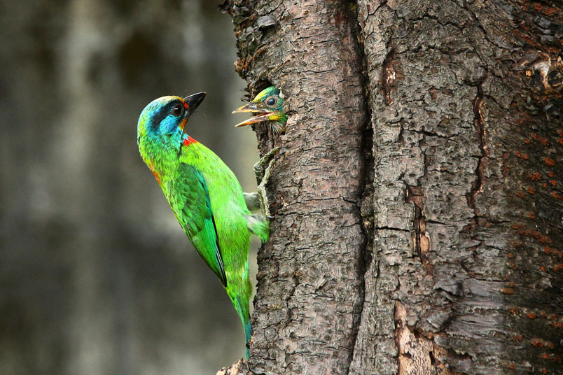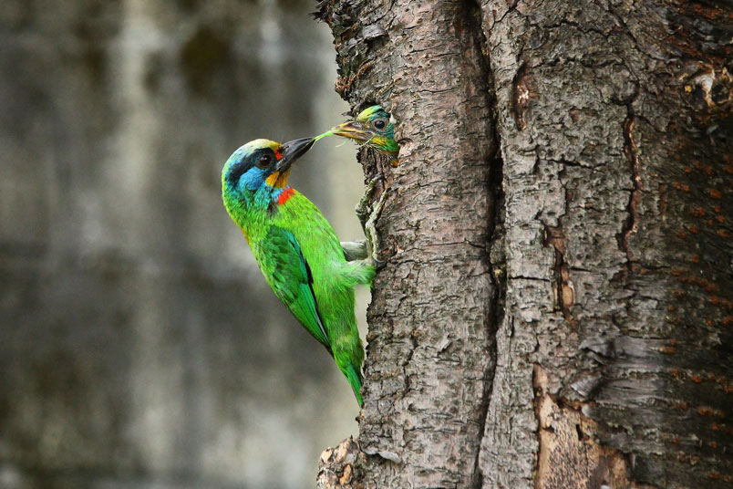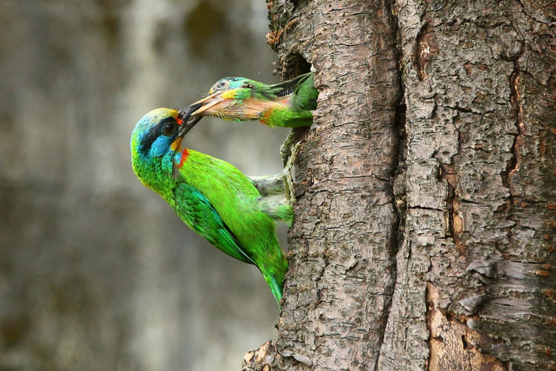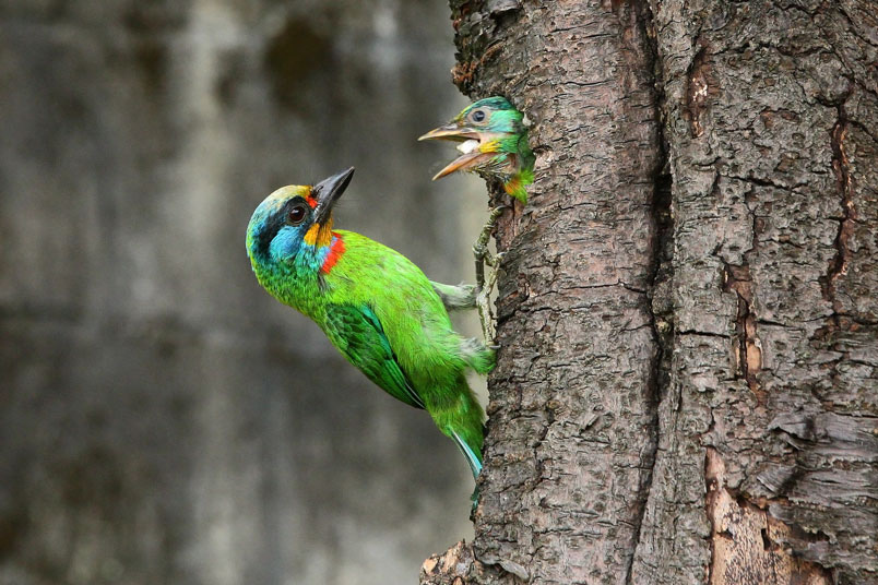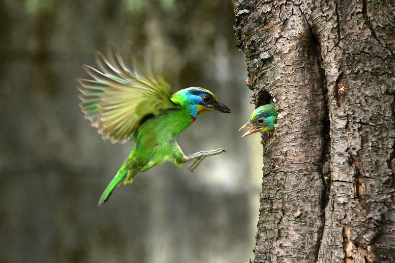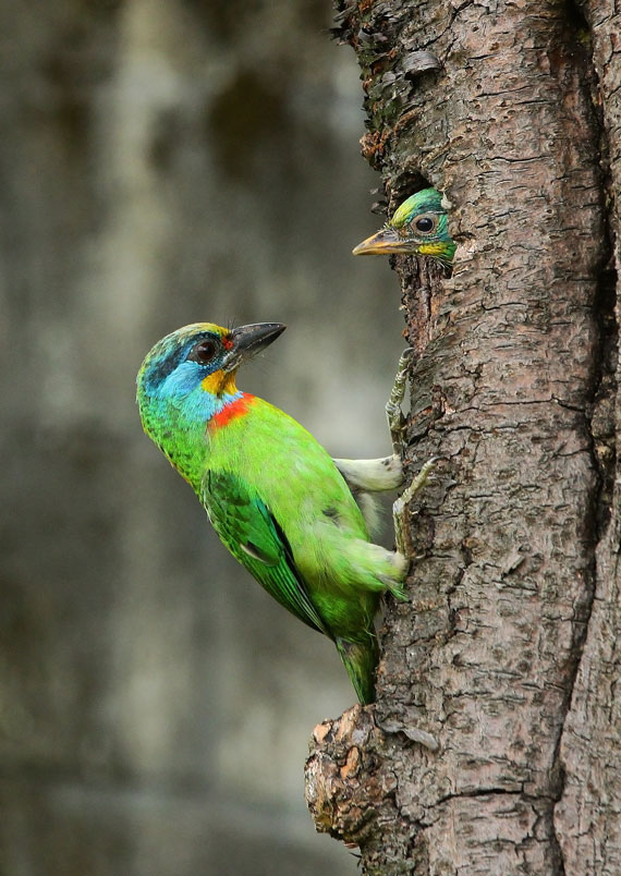 返餵食,樹洞內還有一隻雛鳥,會到洞口好奇張望,當親子同時出