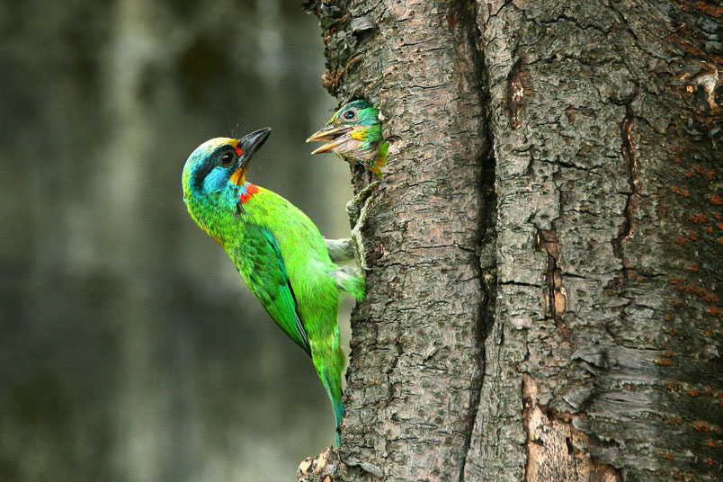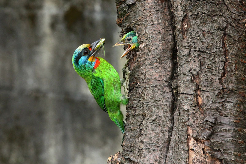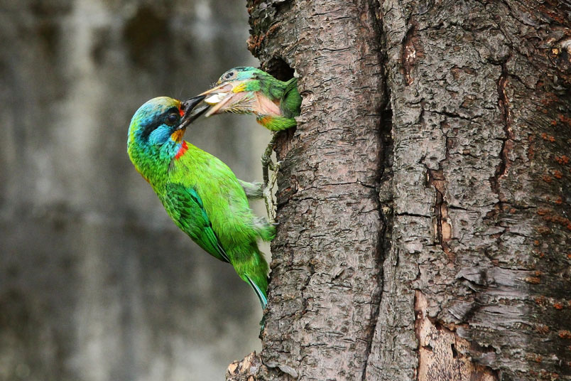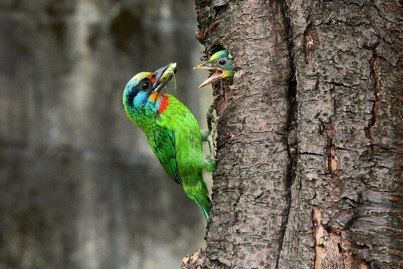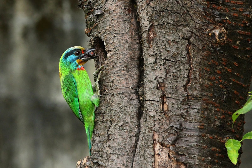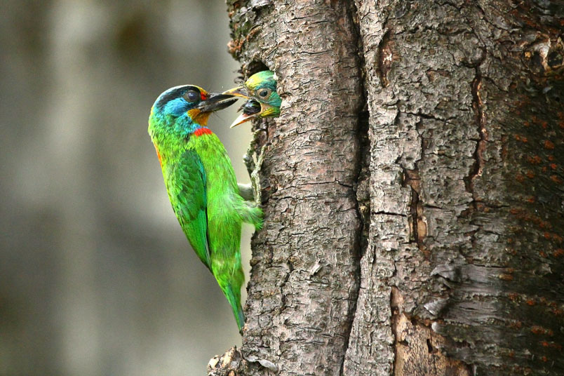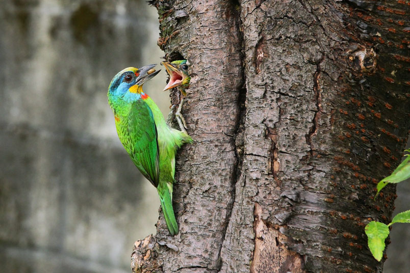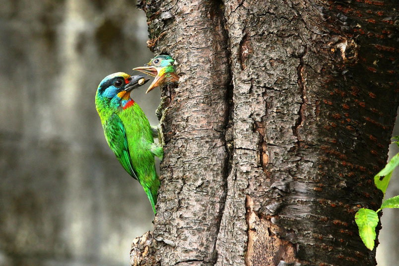 五色鳥一大清早出門覓食,金龜子、雀榕果實都是雛鳥的主食;由
