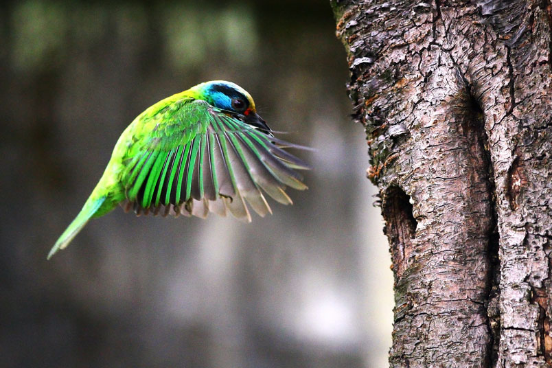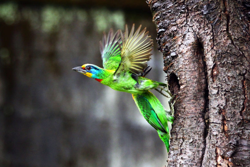 於五色鳥毛色鮮豔,振翅飛揚、叼食育雛都是都會區值得記錄的生