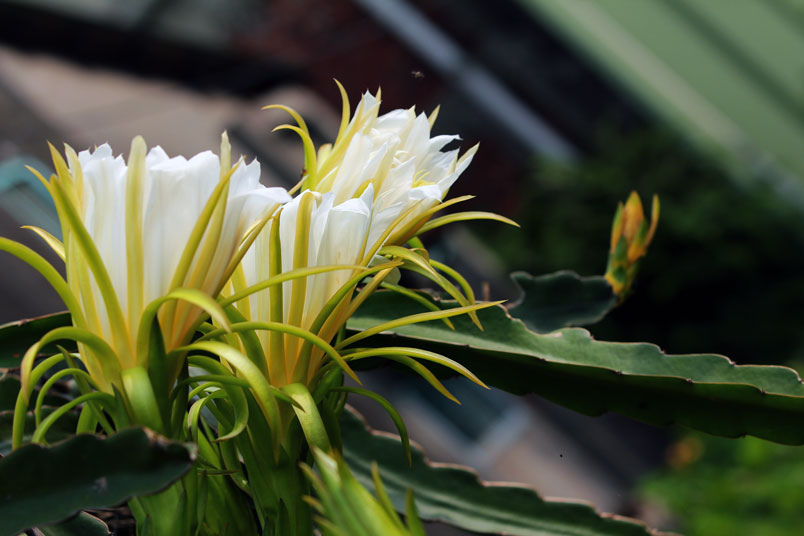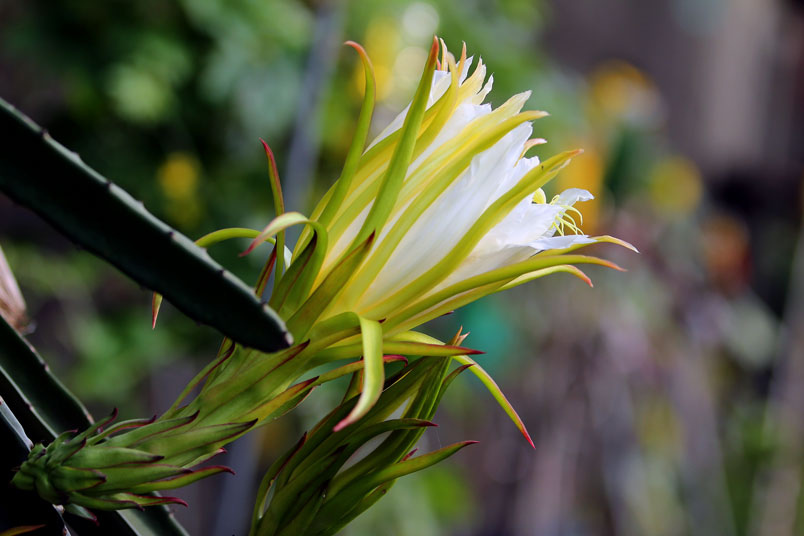 火龍果花苞在天黑後逐漸開起,到晚上十點許全開;清晨,花