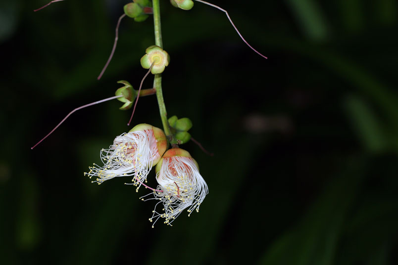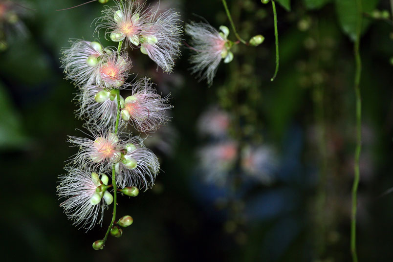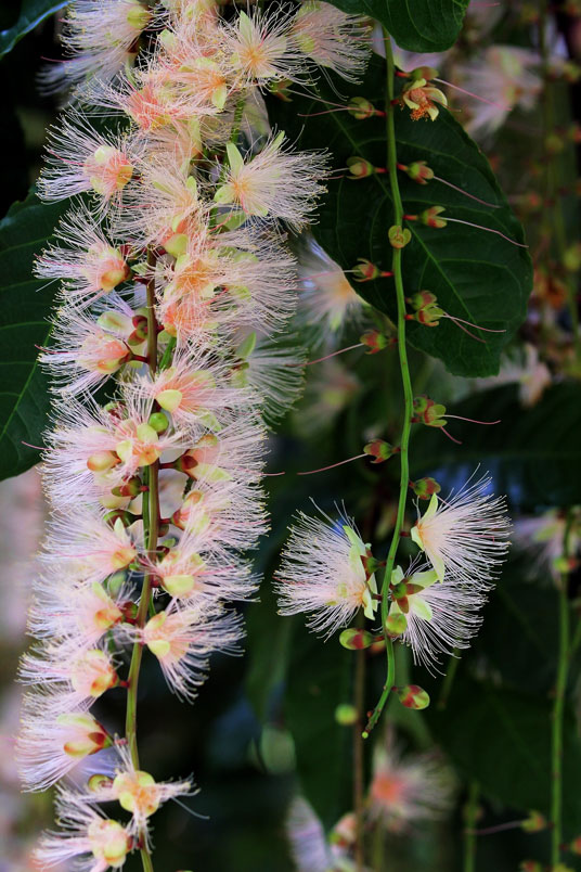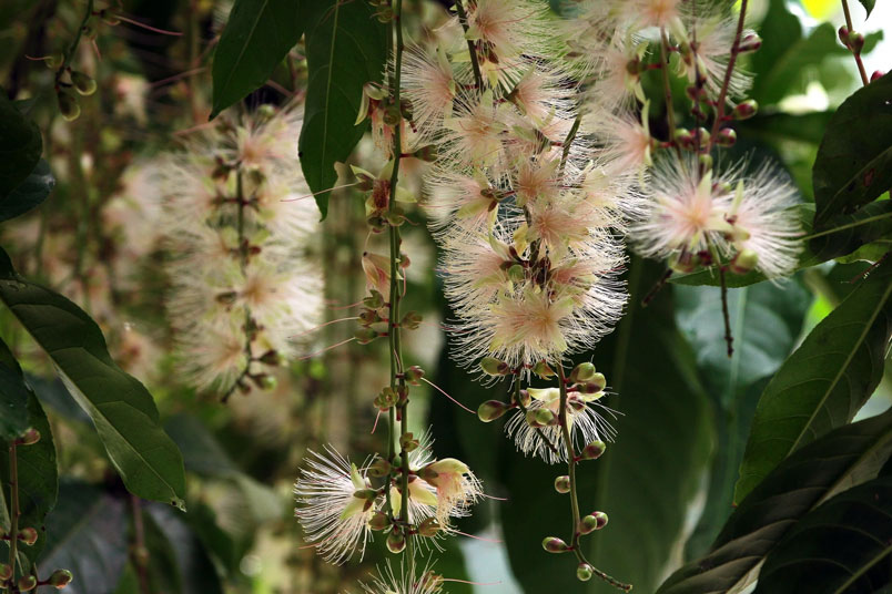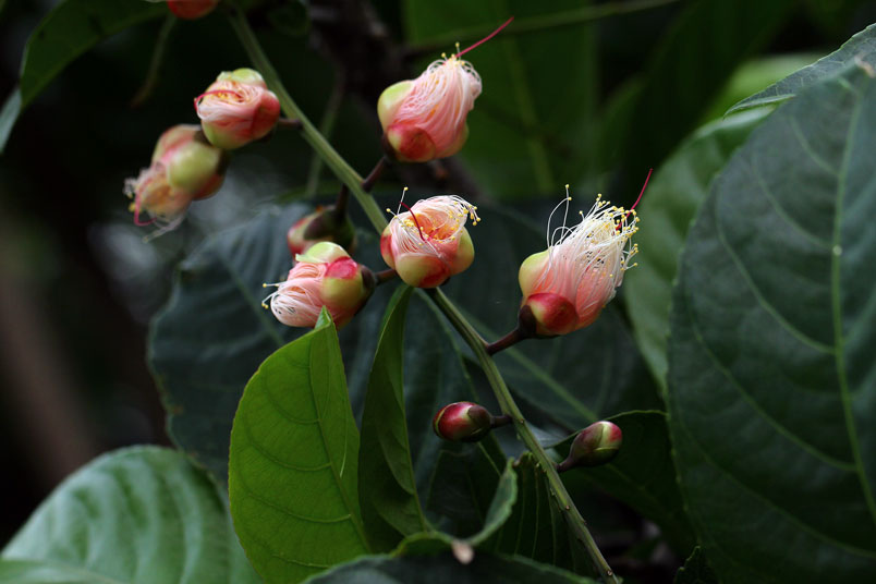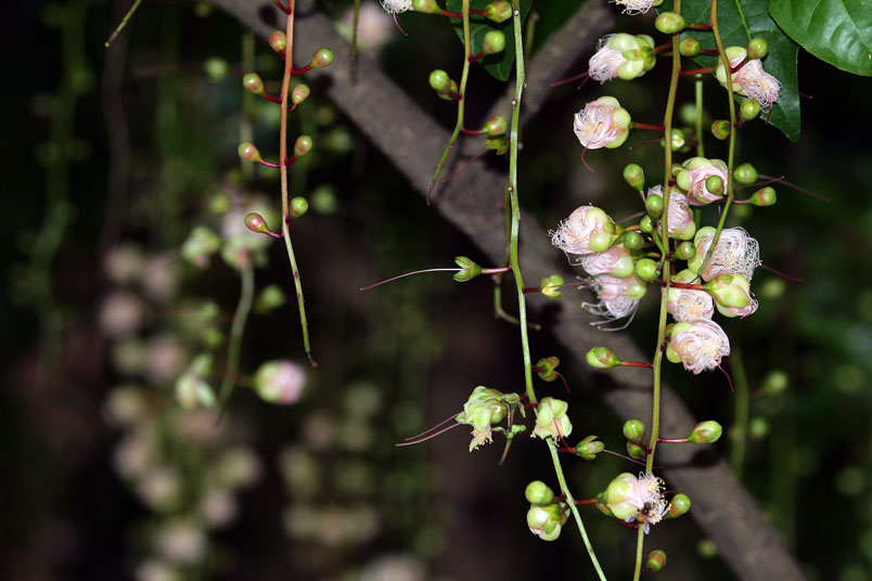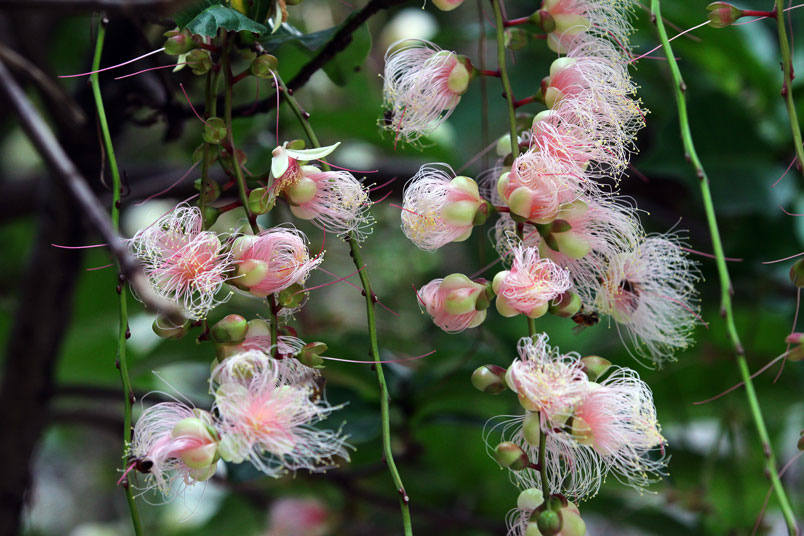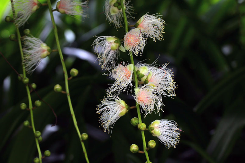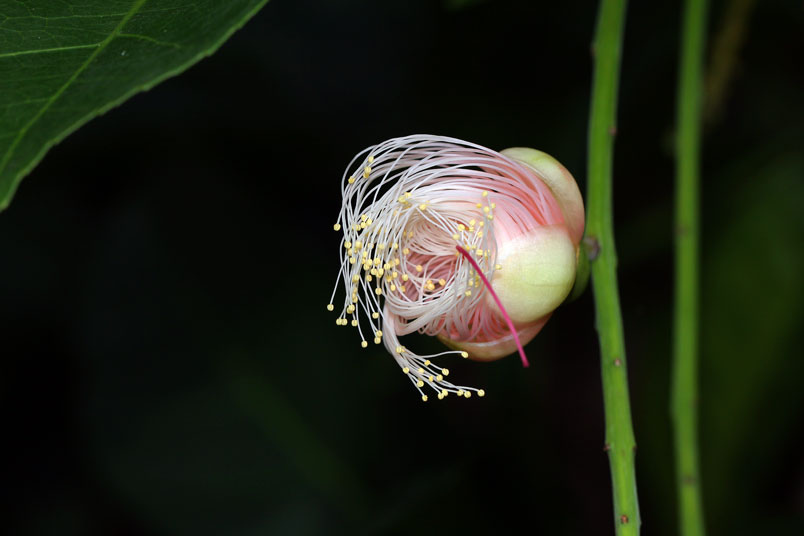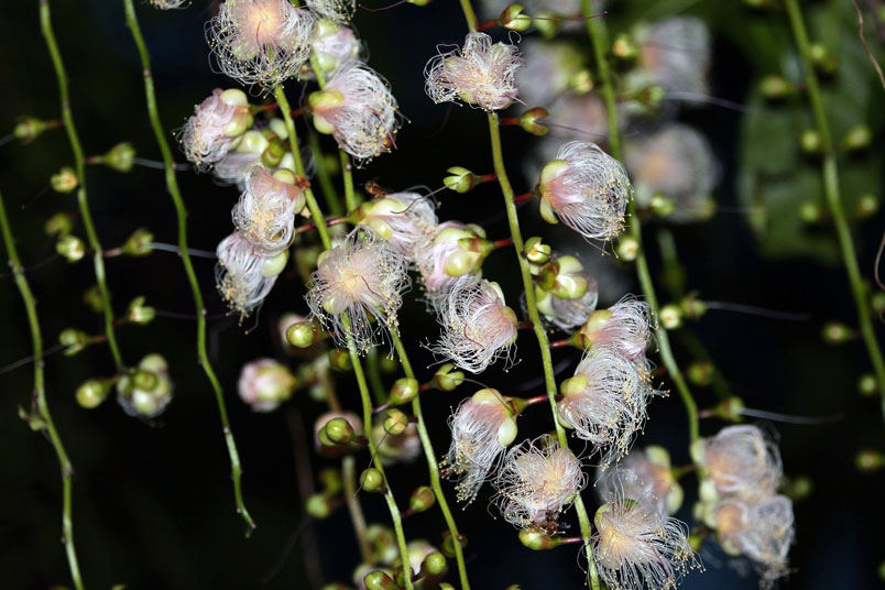 花瓣為乳白色,由許多淡粉紅色的雄蕊所襯托。