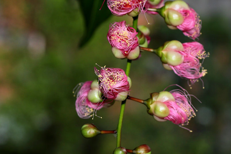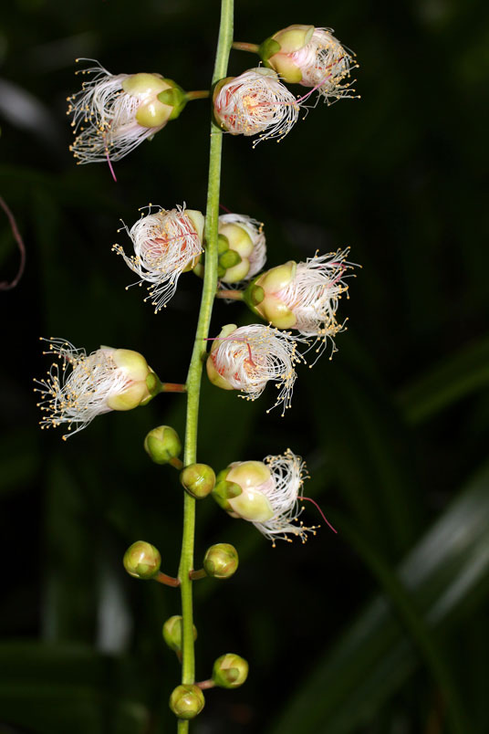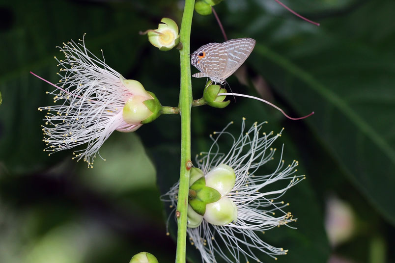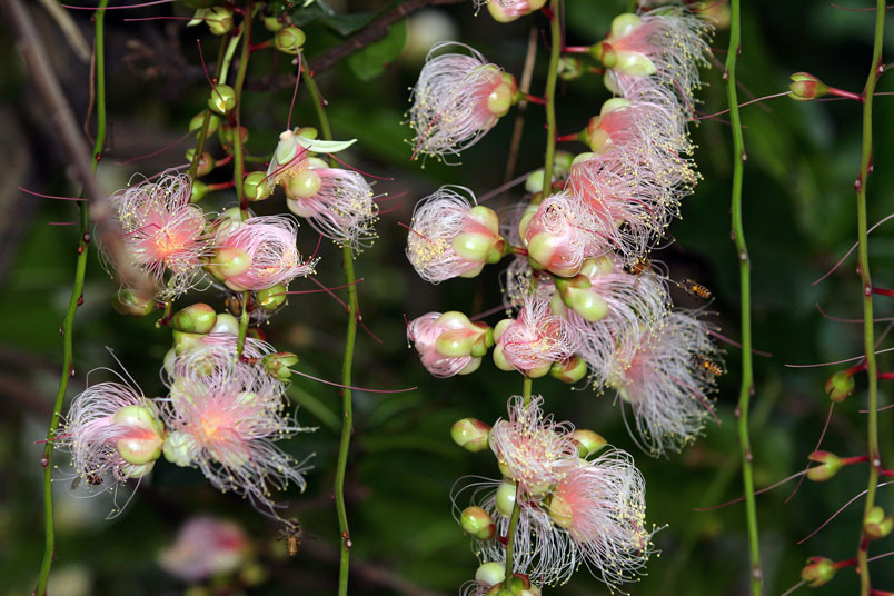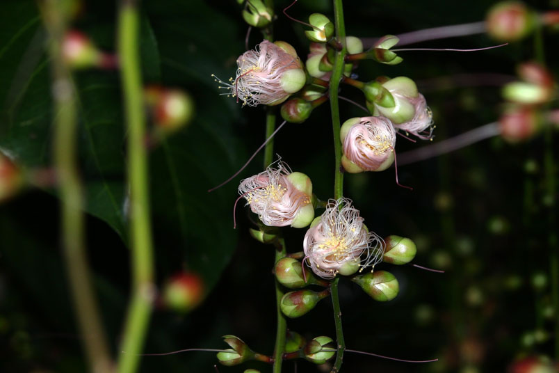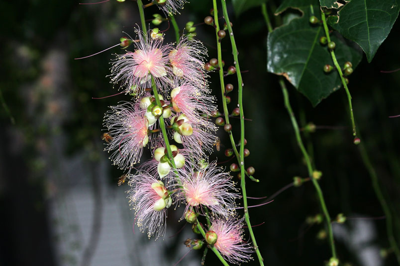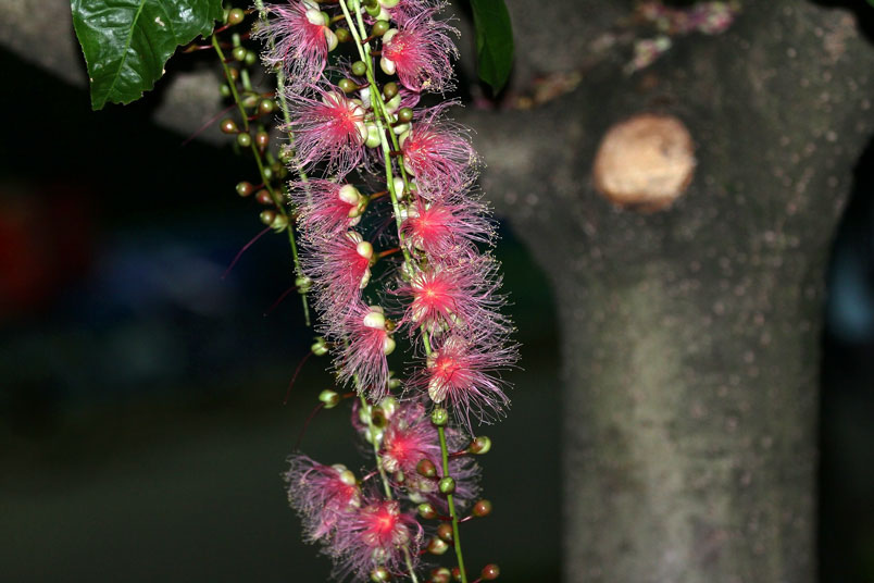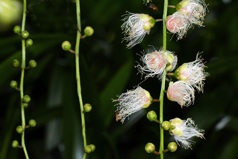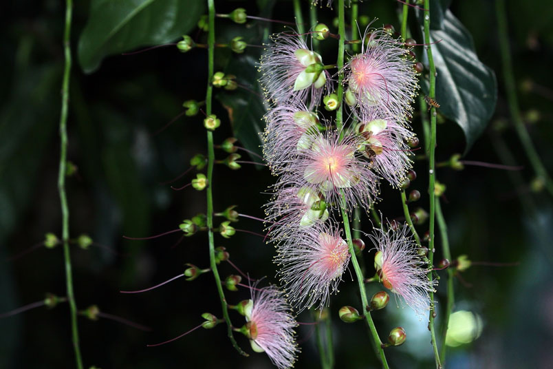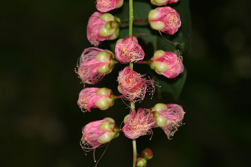 花瓣為乳白色,由許多淡粉紅色的雄蕊所襯托。
