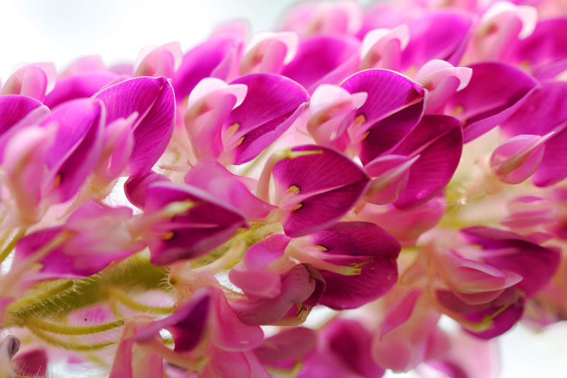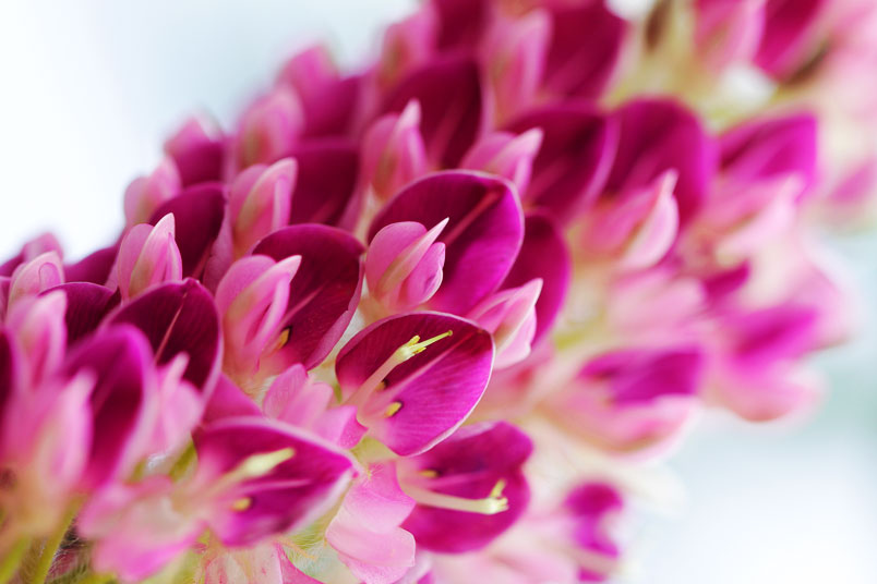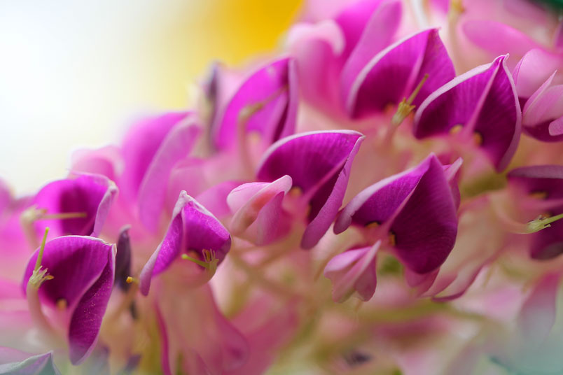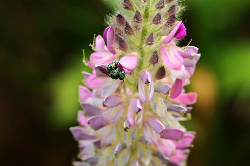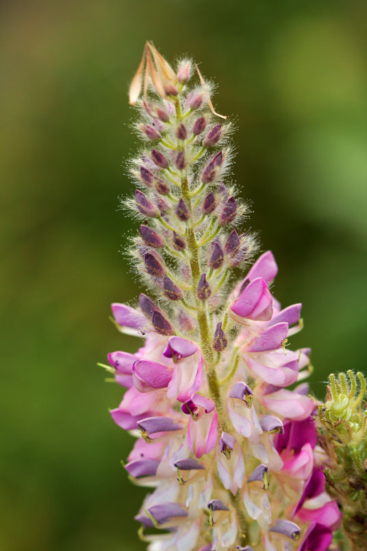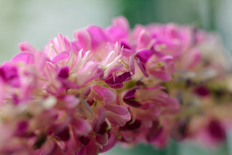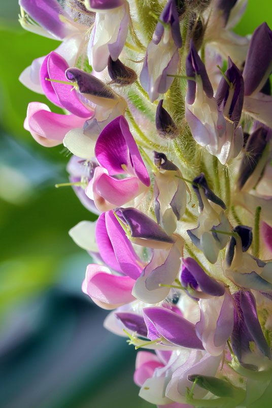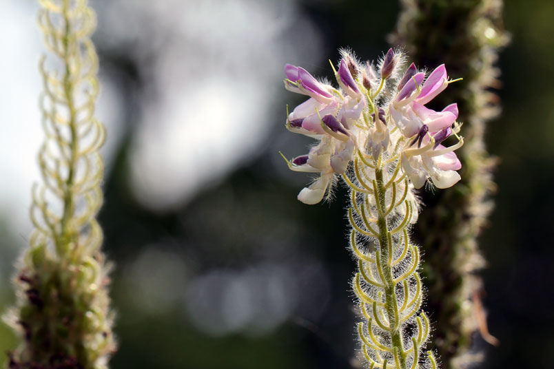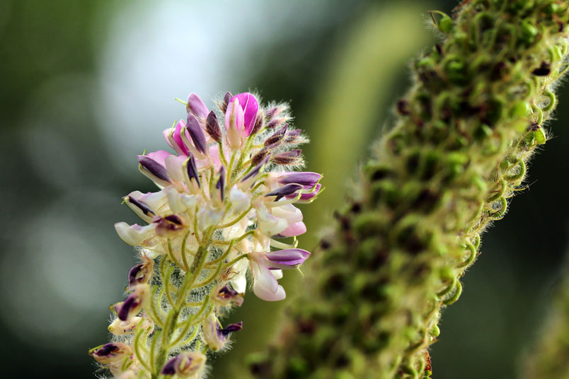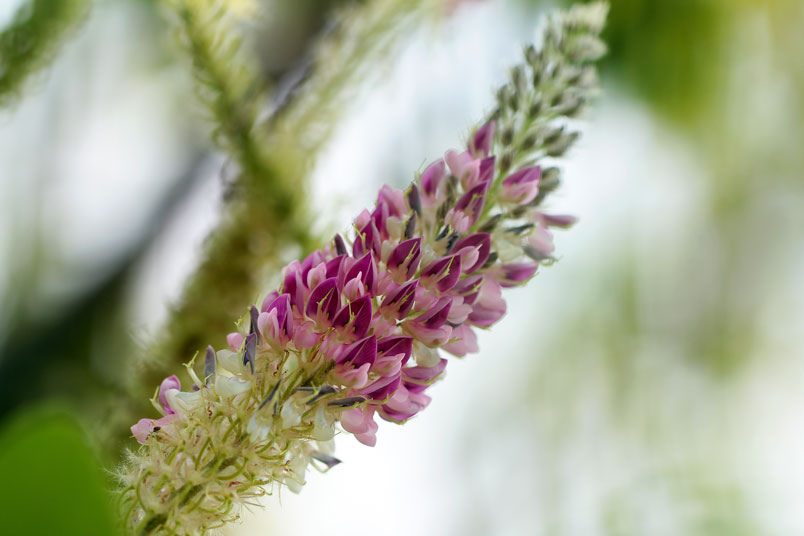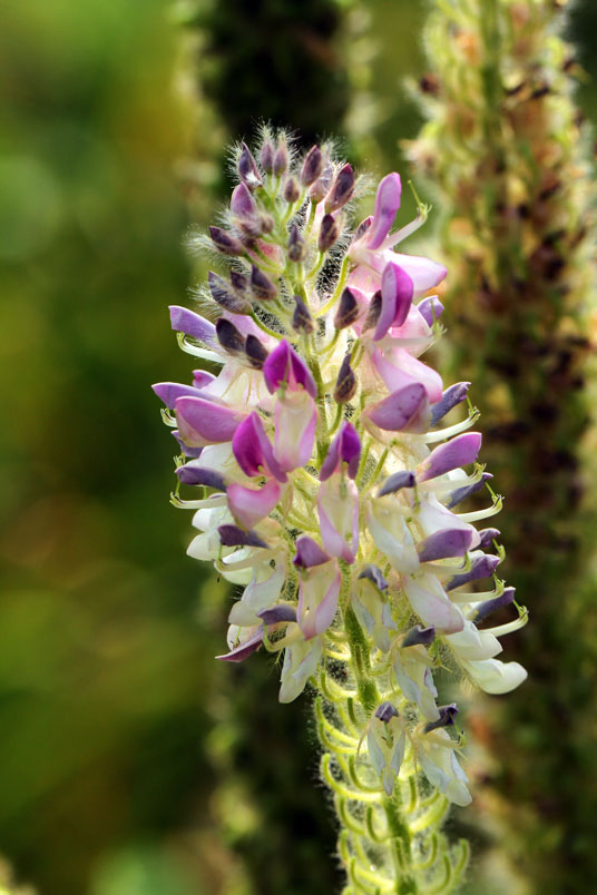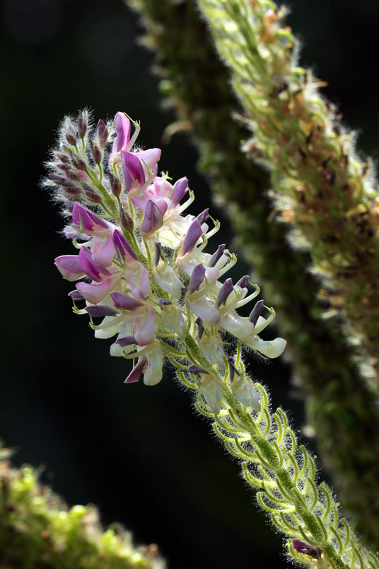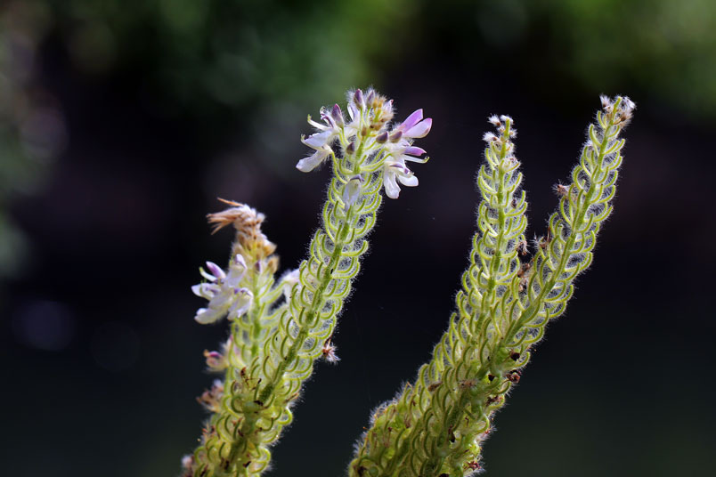 花極稠密;萼管極短;花冠蝶形,紫色,旗瓣闊,翼瓣和龍骨瓣粘
