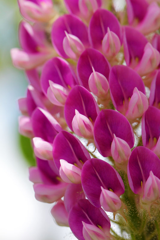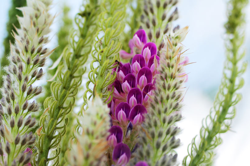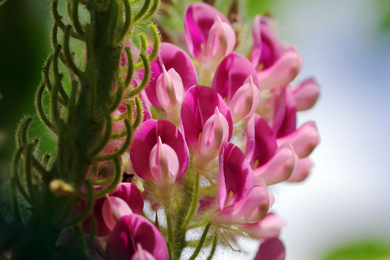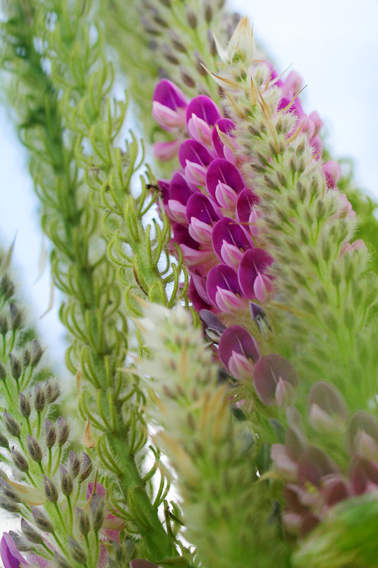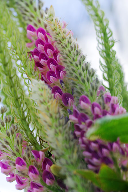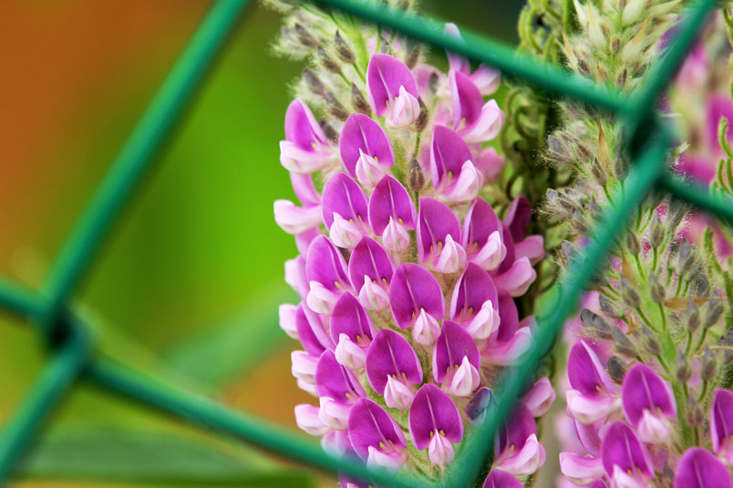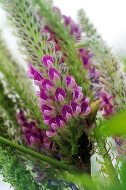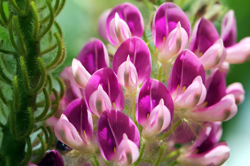 每一朵小花長約5至7公厘,紫紅色,蝶形花冠,2小花著生密