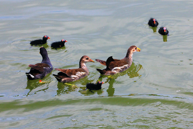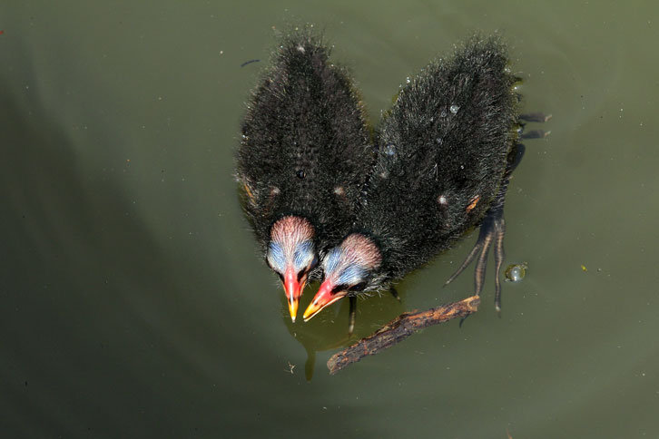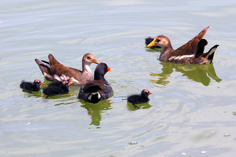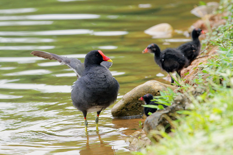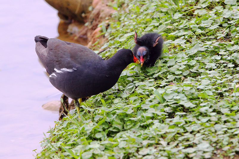 紅冠水雞也有巢邊幫手的習性;第一代兄姊級的紅冠水雞長大