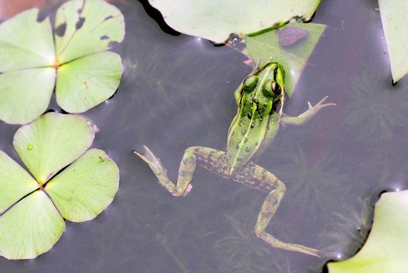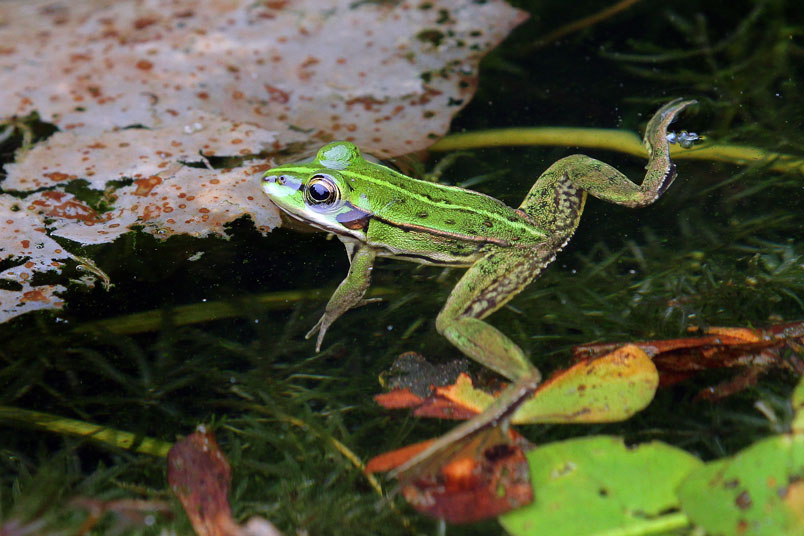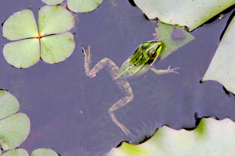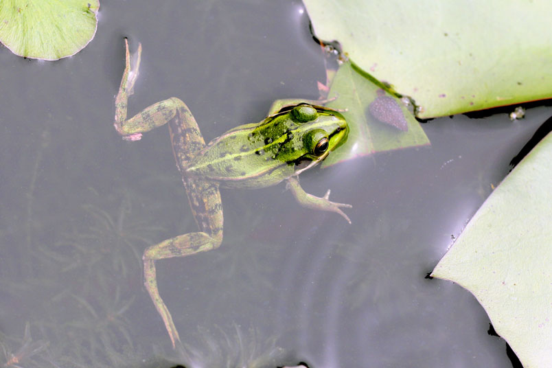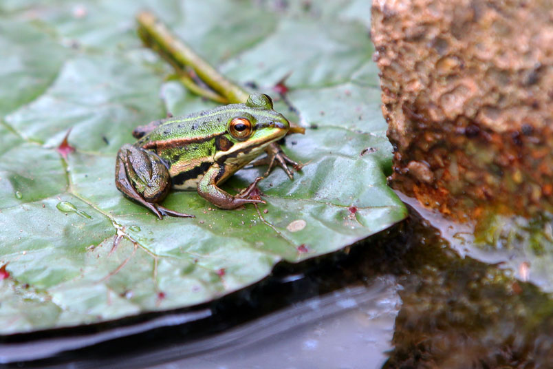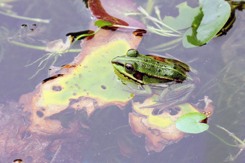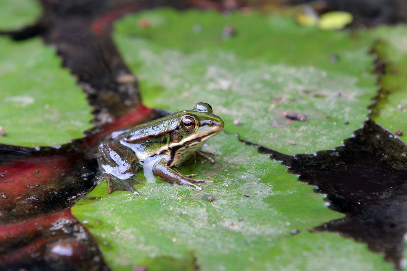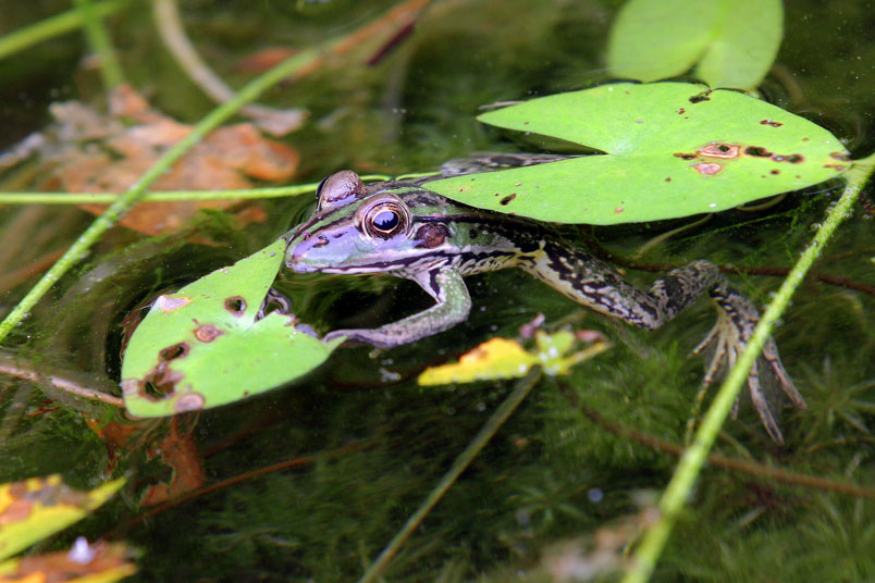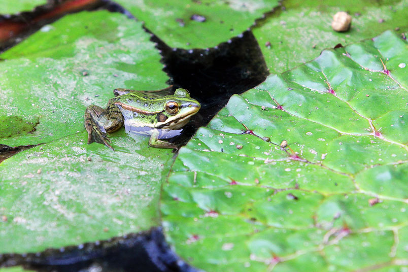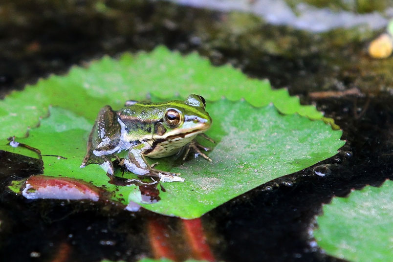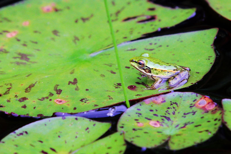 金線蛙生性隱密機警,多半藏身在水生植物的葉片下,僅露