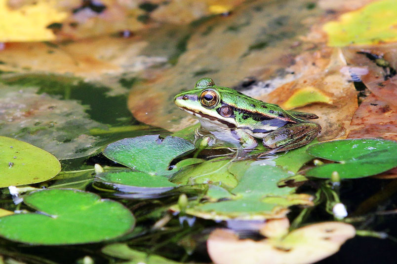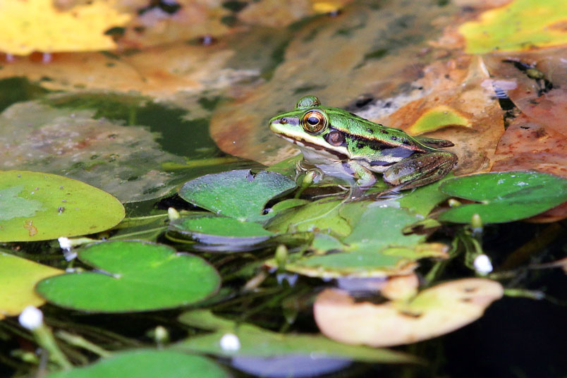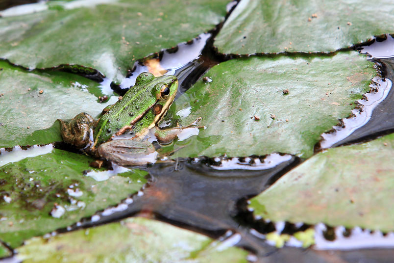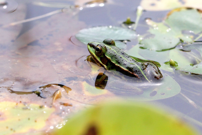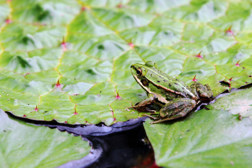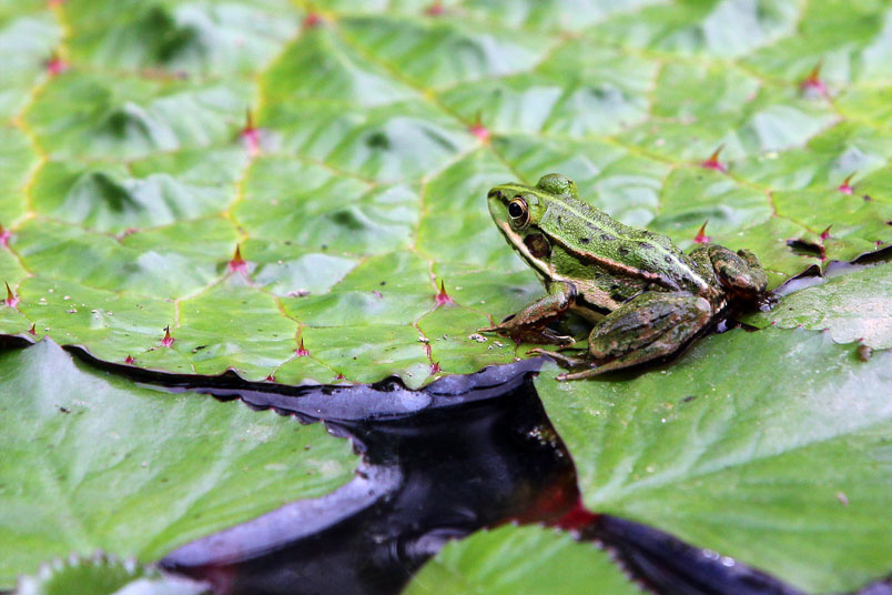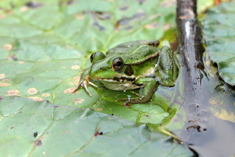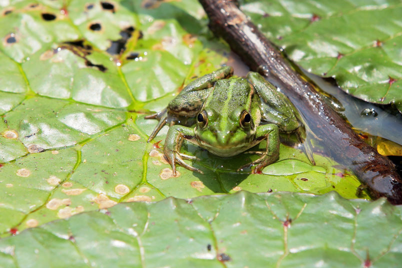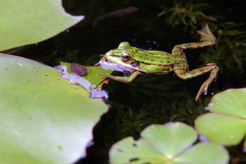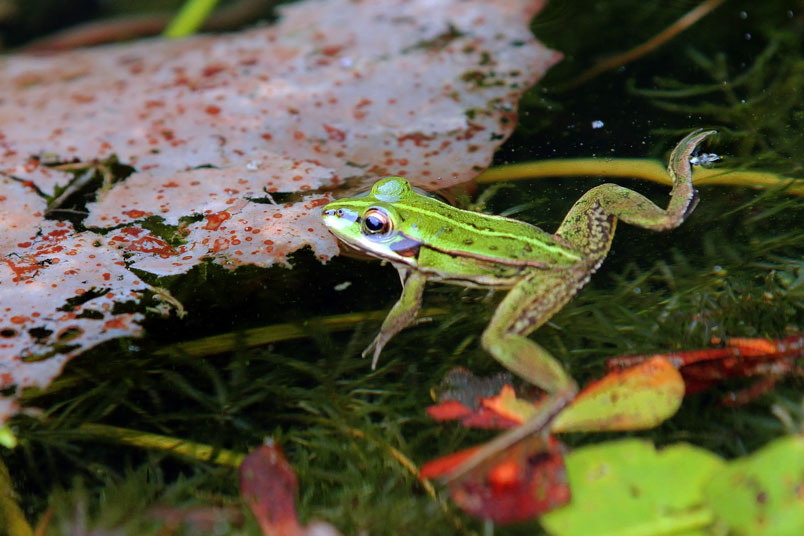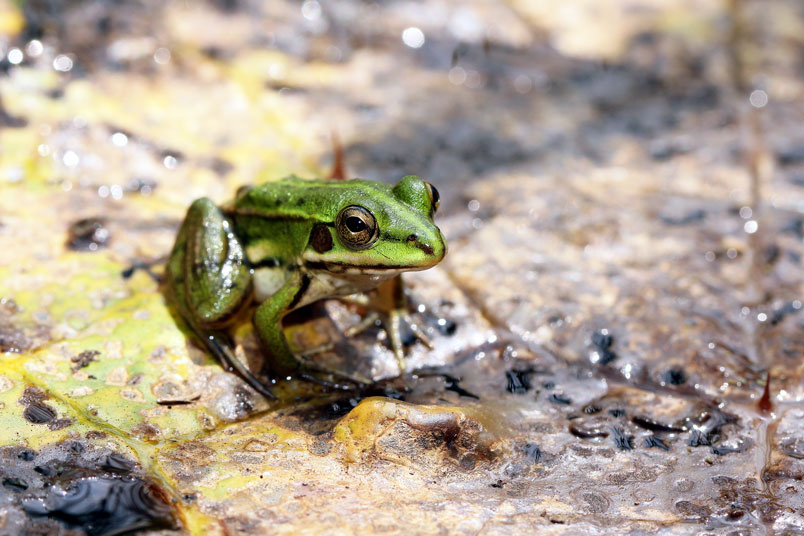 金線蛙生性隱密機警,多半藏身在水生植物的葉片下,僅露