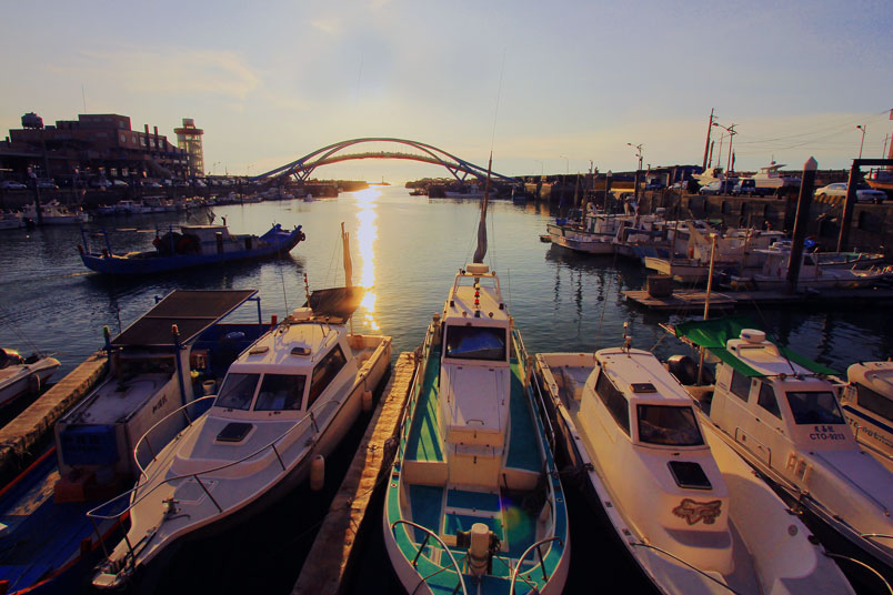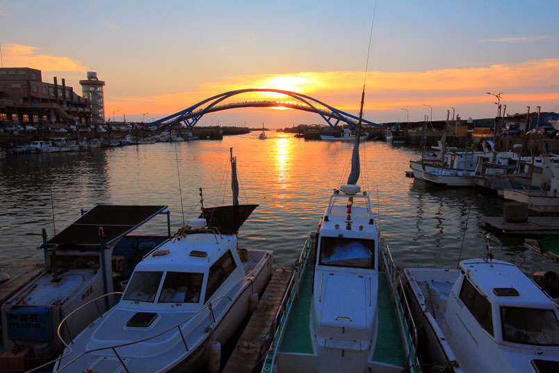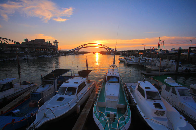 在港區水面泛成一片光彩奪目,讓漁港也有浪漫的一面!