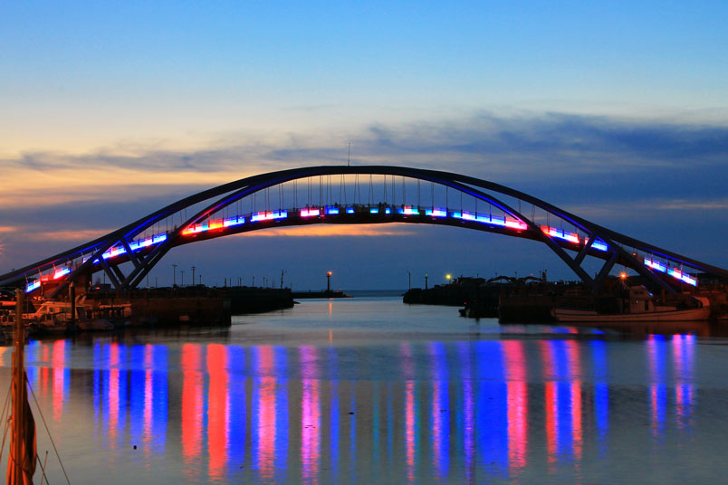 夜幕低垂,橋身的投射燈逐一點亮,紅、藍相間色彩讓橋身倒映
