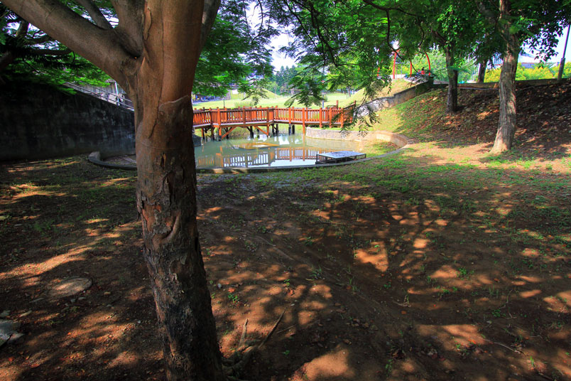 筆直的長橋與和緩坡度的小丘成了明顯的對比,偌大的草