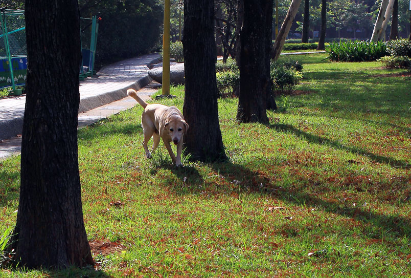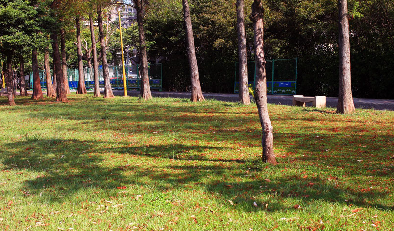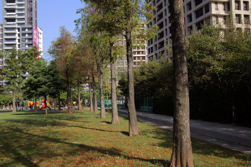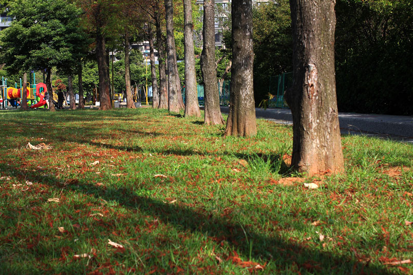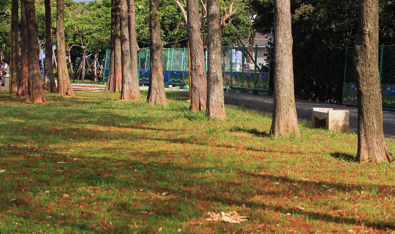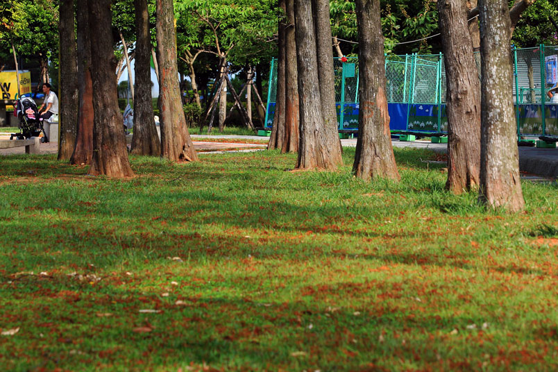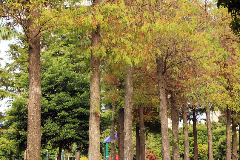公園內數十棵落羽松綠葉開始轉黃,想起去年為了拍落羽松