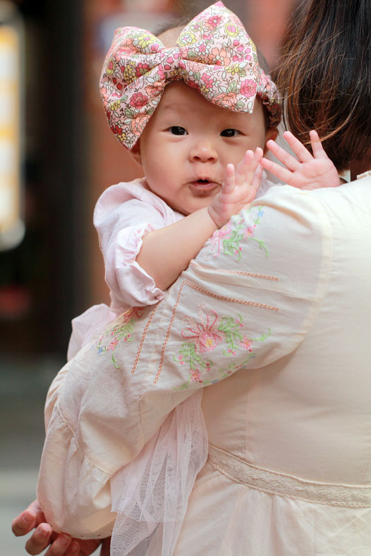 ,開始圍上外婆家送的圍兜兜和胖仔褲(開襠褲)。