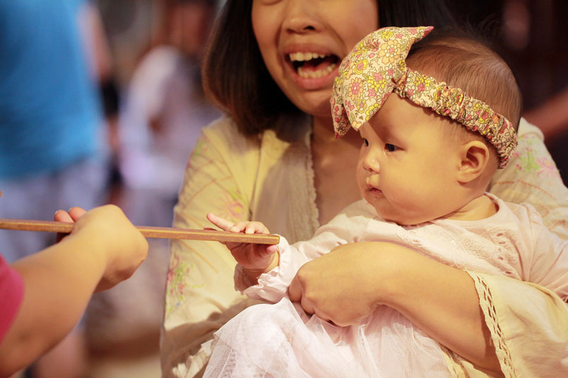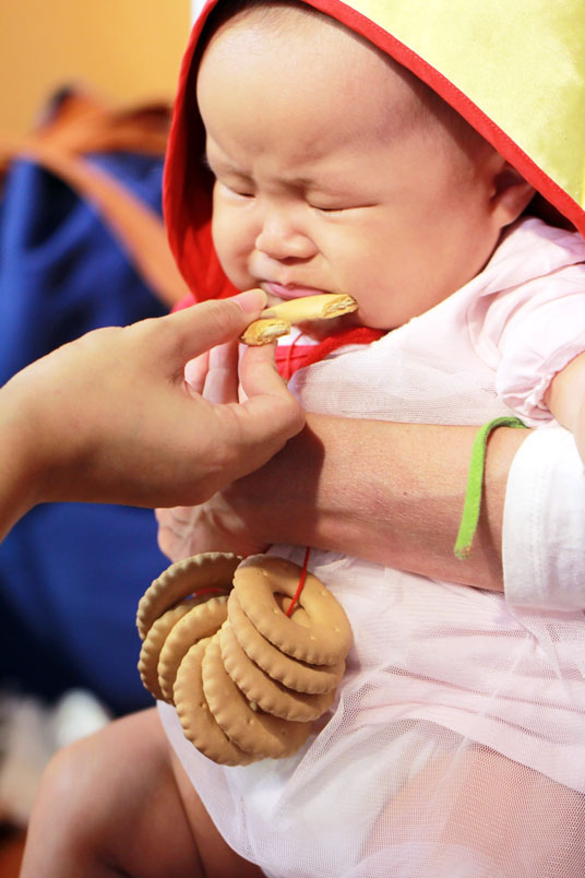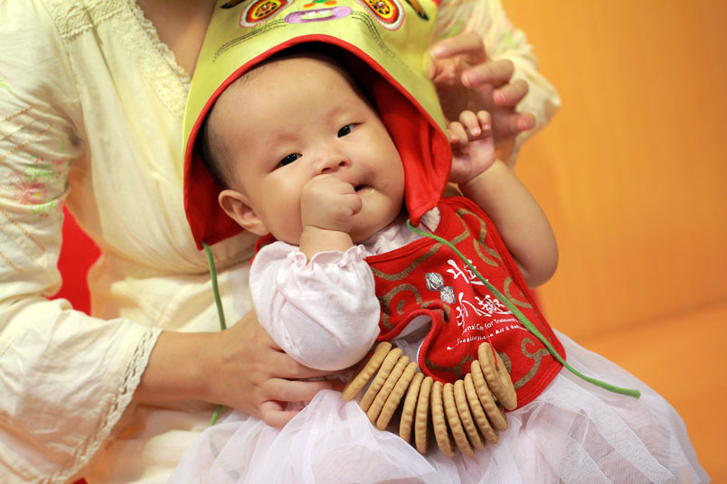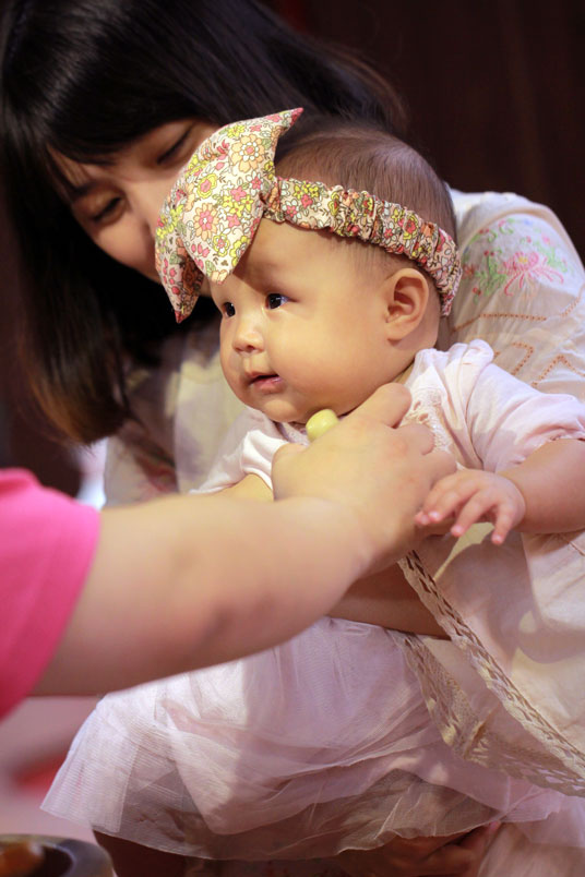 有些地方還舉行「開葷」,讓嬰兒嚐嚐魚、肉等葷類食物