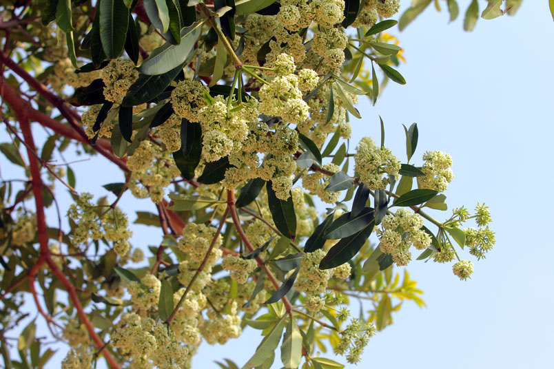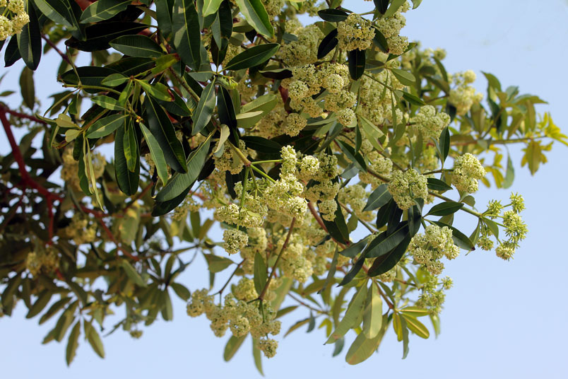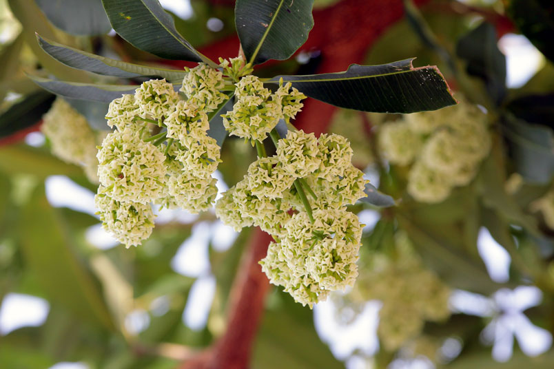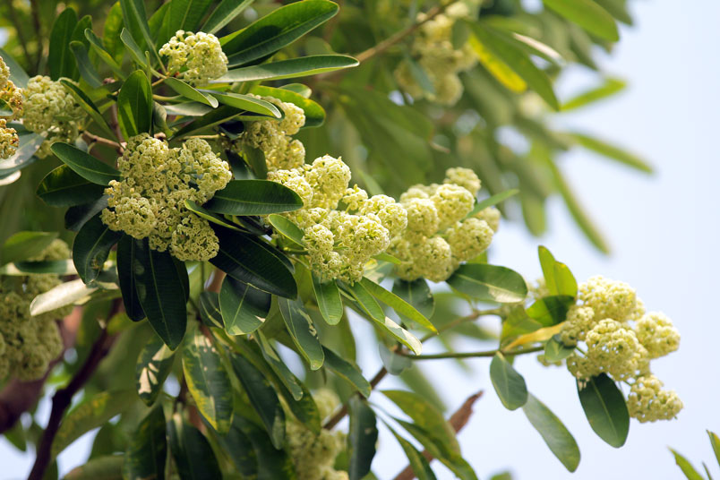 現在正是黑板樹盛花的時節,花滿樹梢,花很小,一朵、二朵、