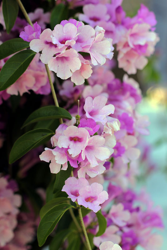 蒜香藤盛開時,彷彿垂掛著團團的粉彩繡球,是極具觀賞