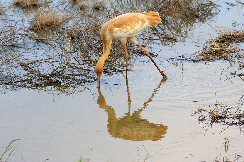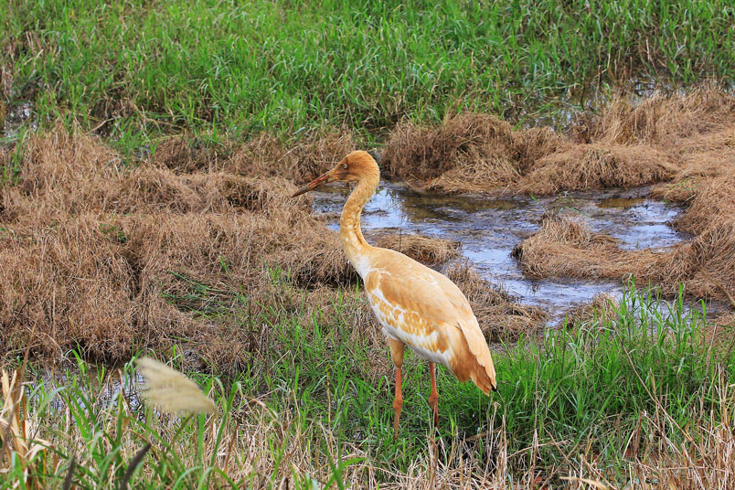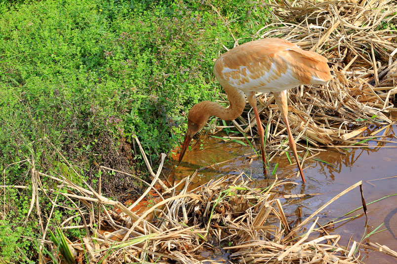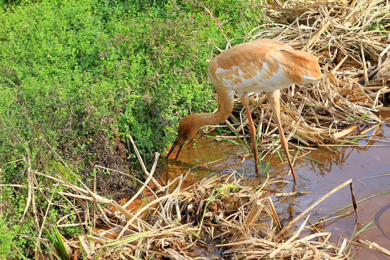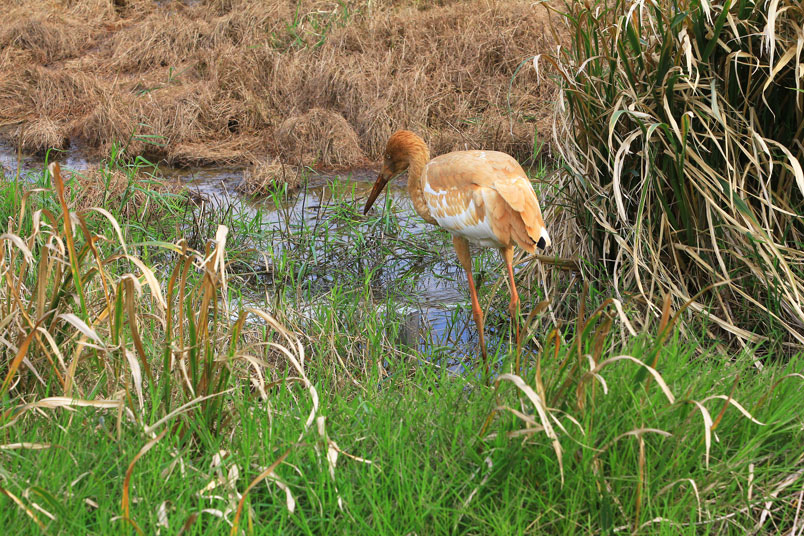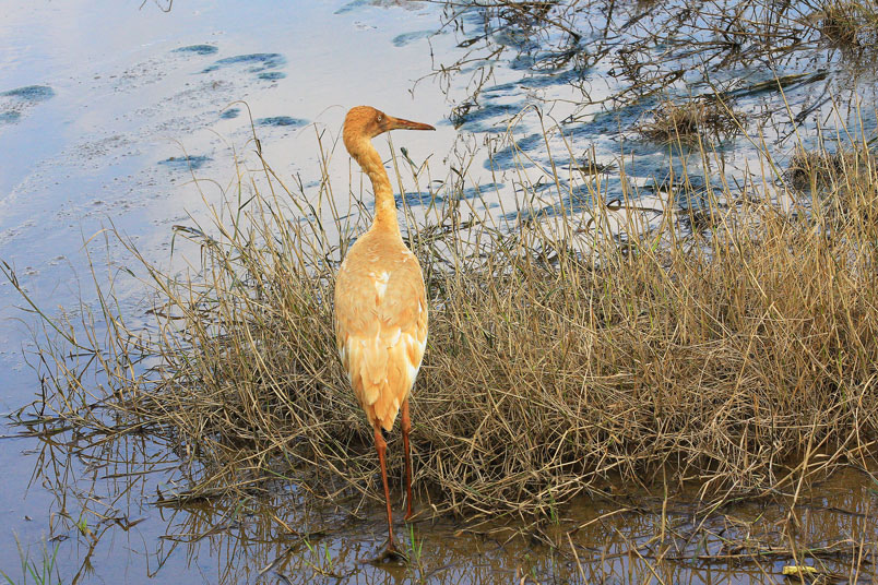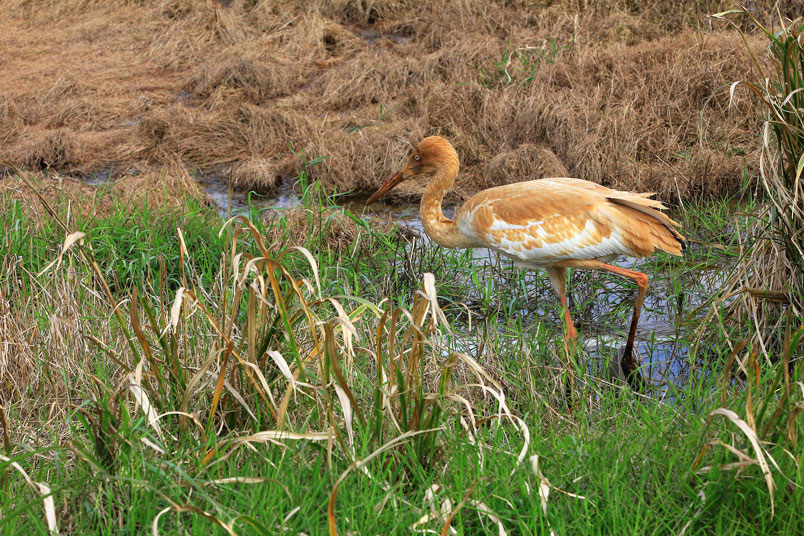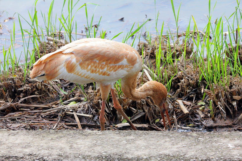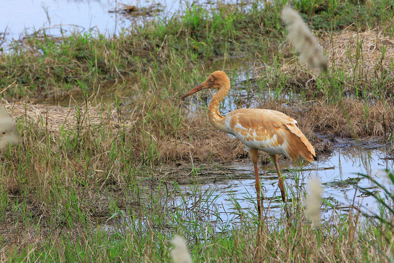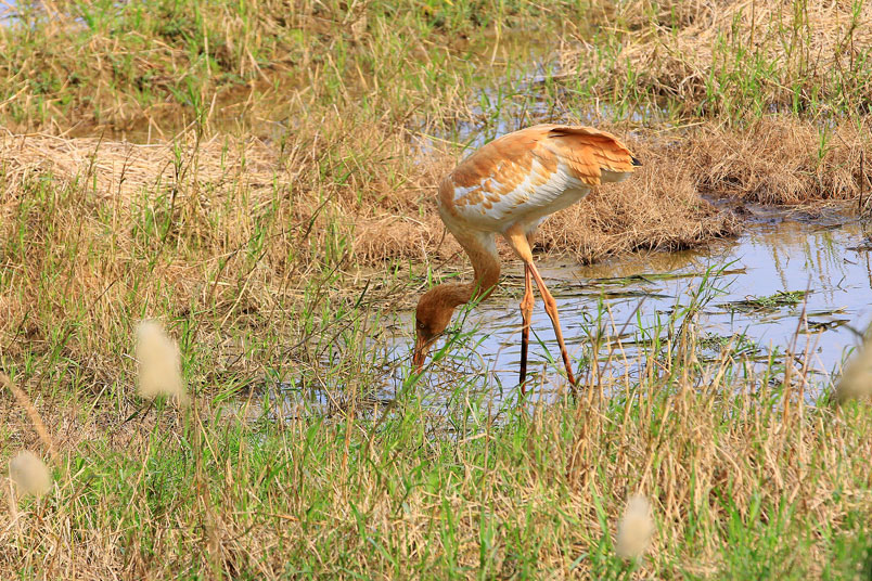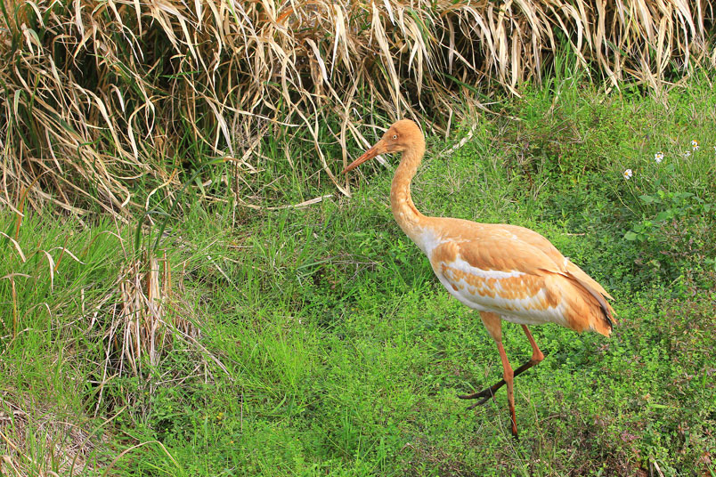 水濕地的依戀性很強,形體比丹頂鶴稍大,牠們粗長而直的