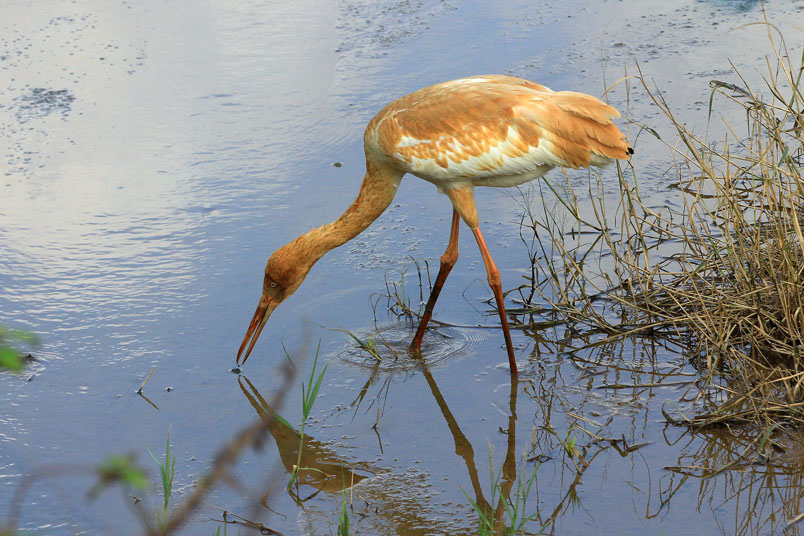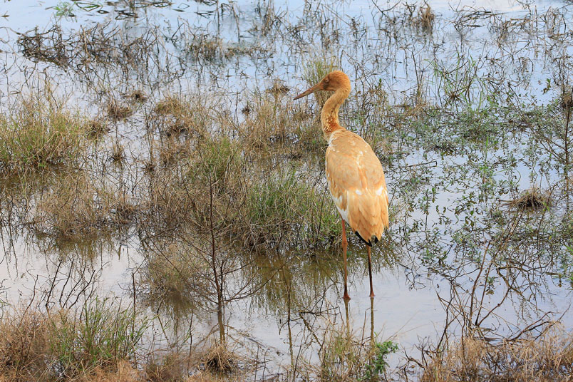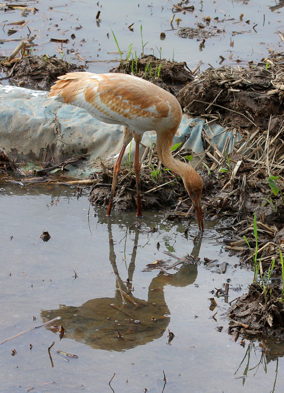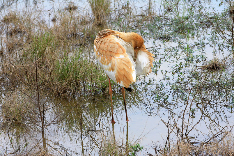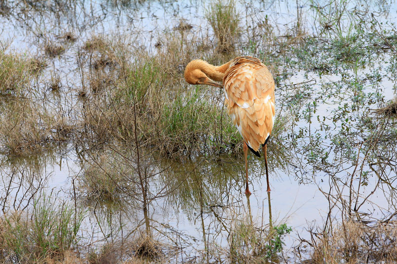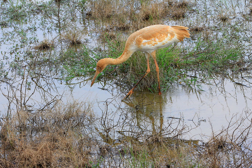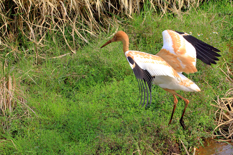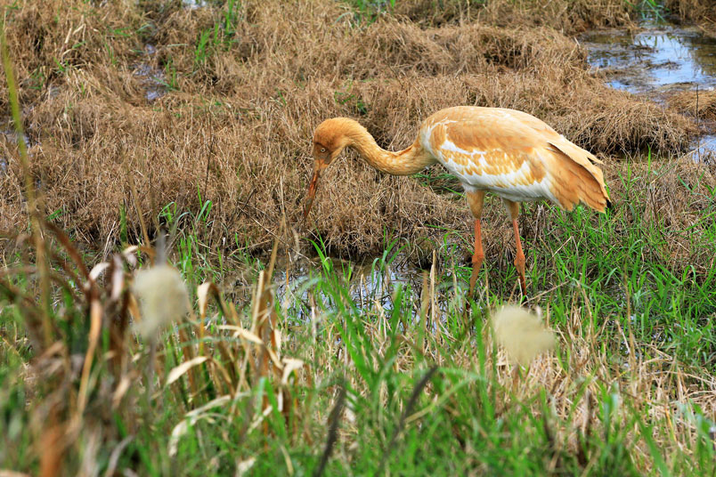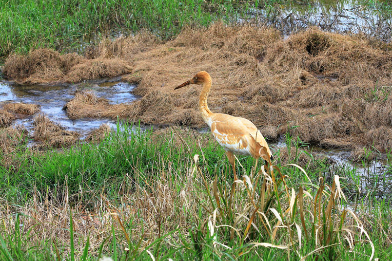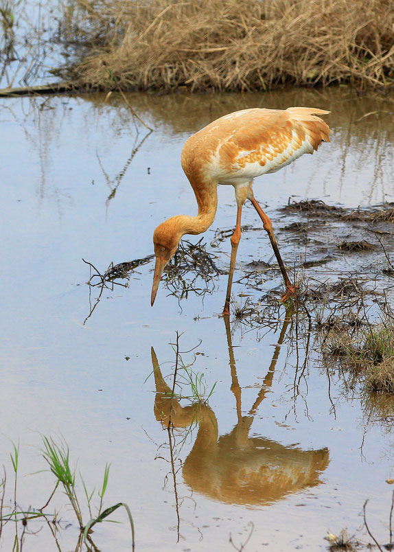 水濕地的依戀性很強,形體比丹頂鶴稍大,牠們粗長而直的