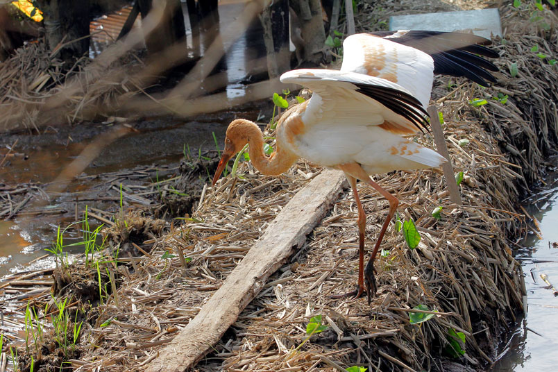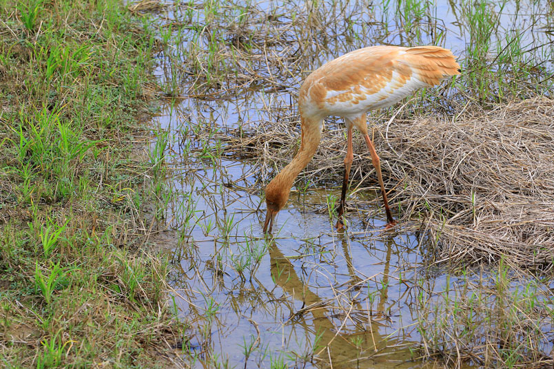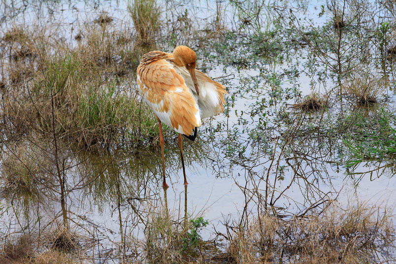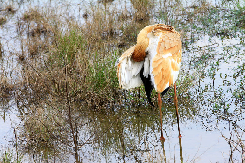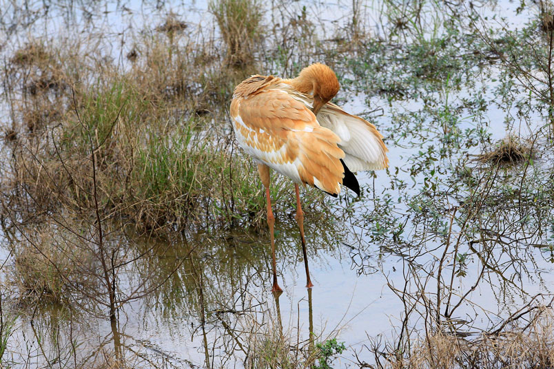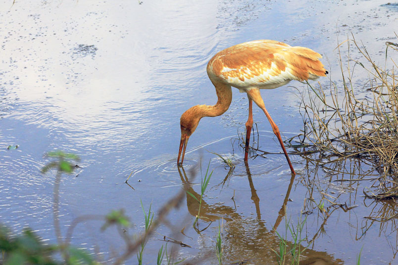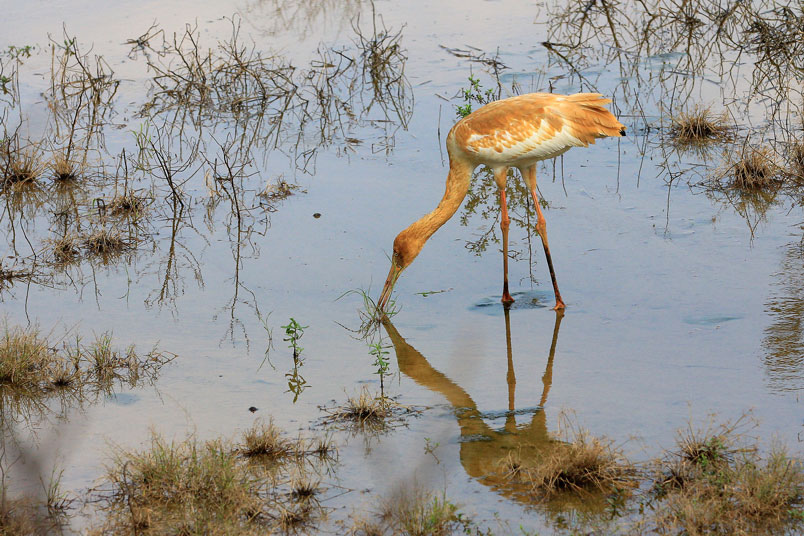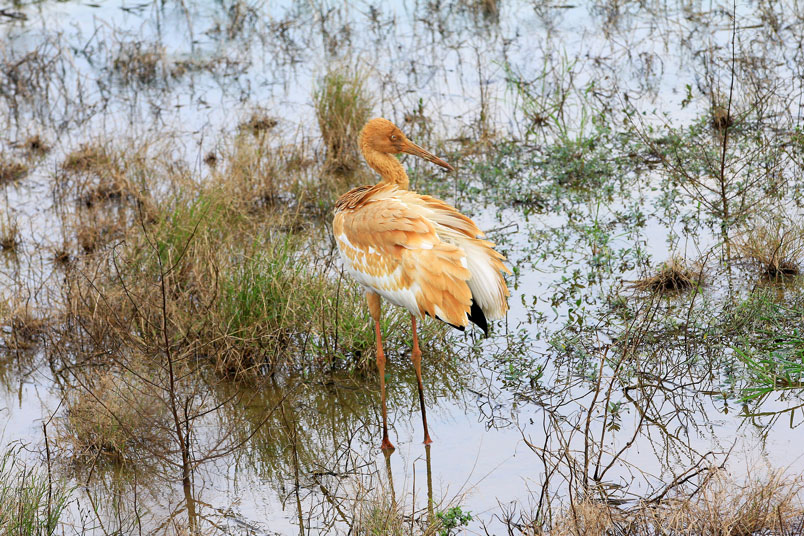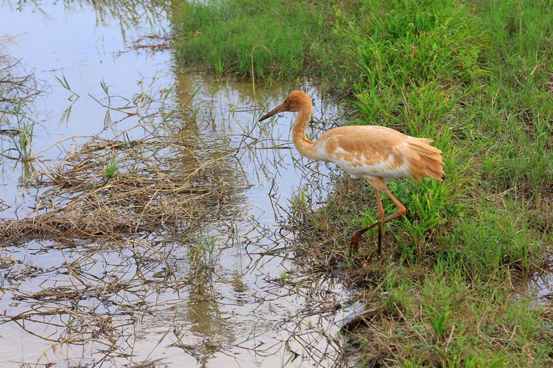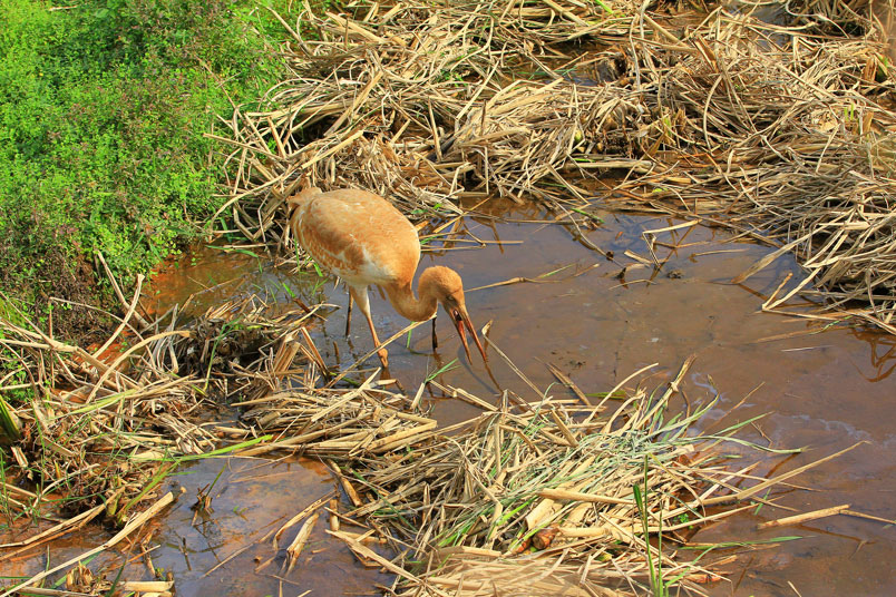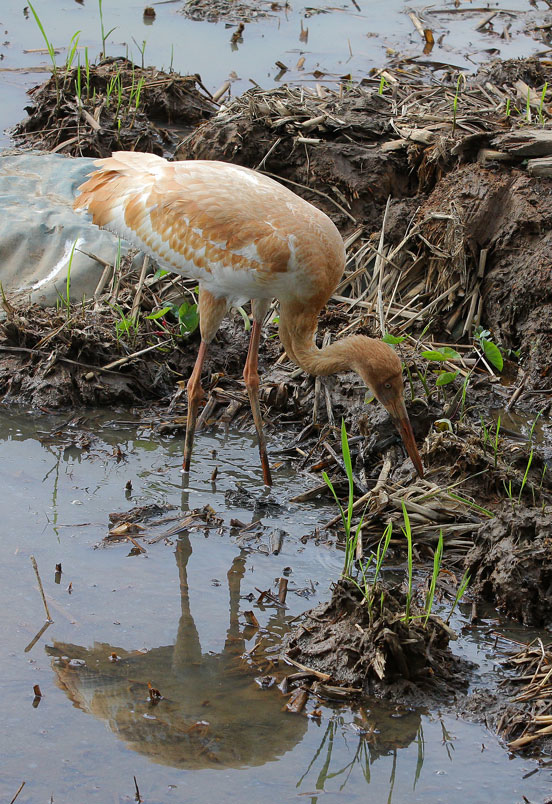 水濕地的依戀性很強,形體比丹頂鶴稍大,牠們粗長而直的
