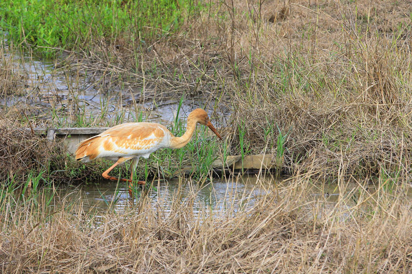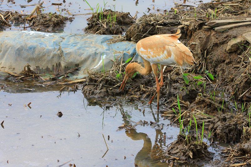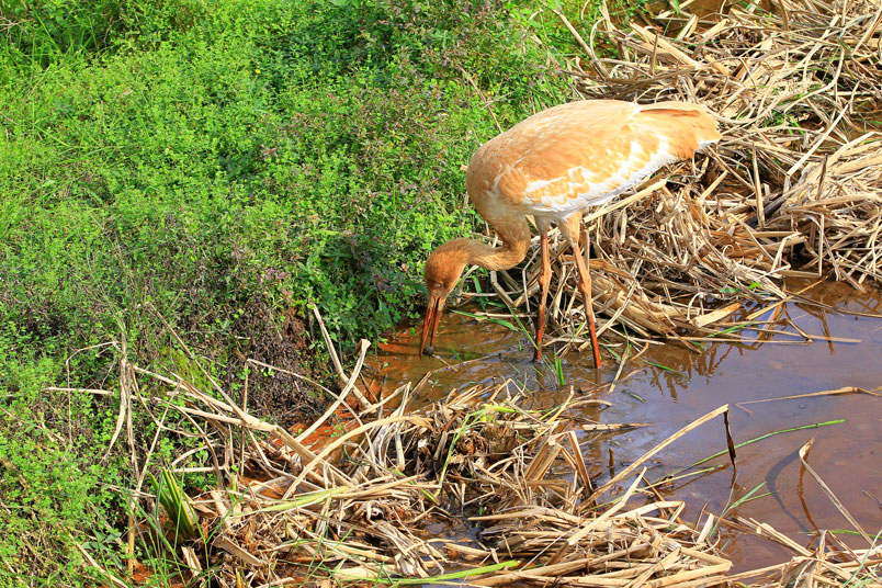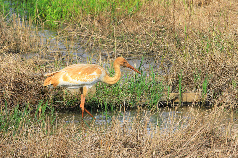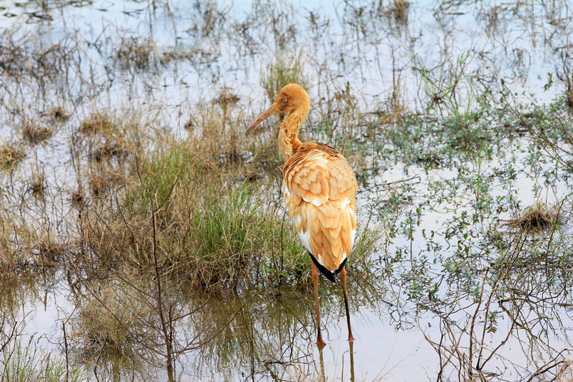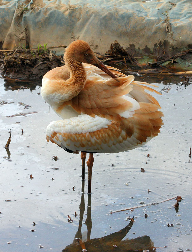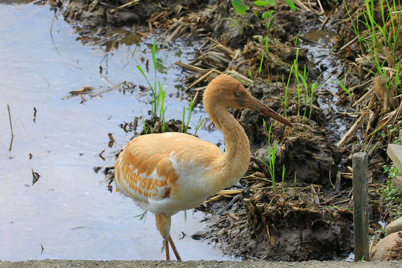 喙呈紅色,頭和腳均很修長,雛鳥的頭和頸呈金褐色,而身