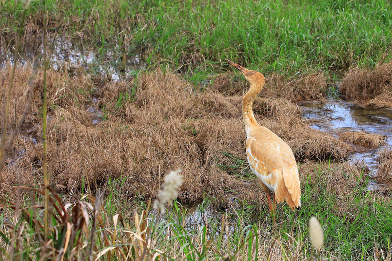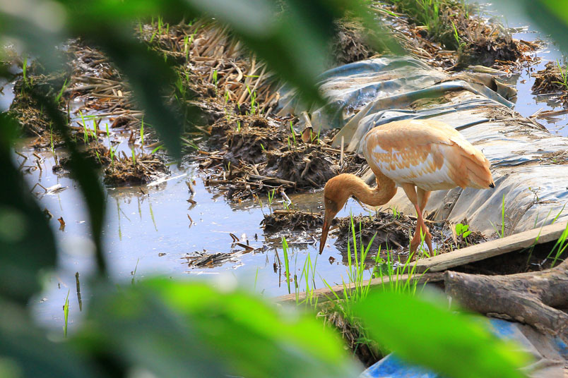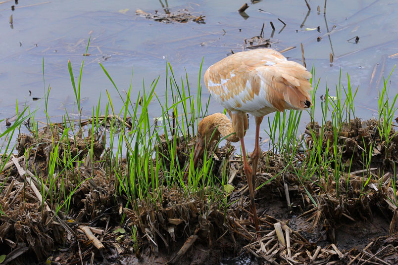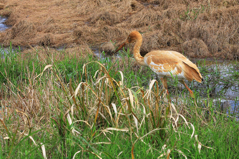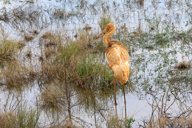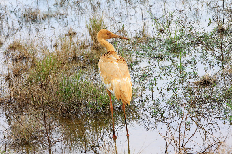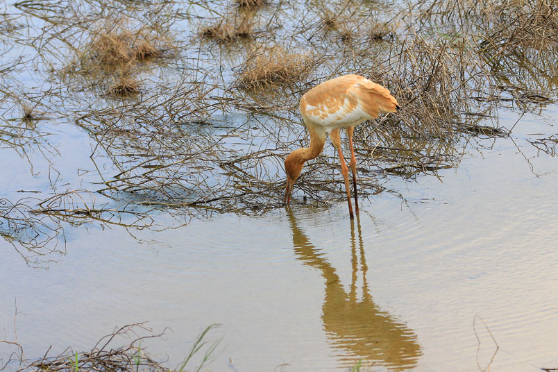 喙呈紅色,頭和腳均很修長,雛鳥的頭和頸呈金褐色,而身