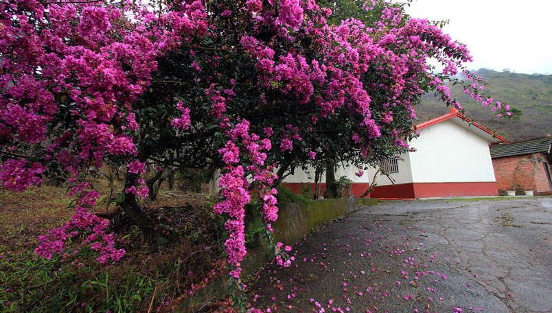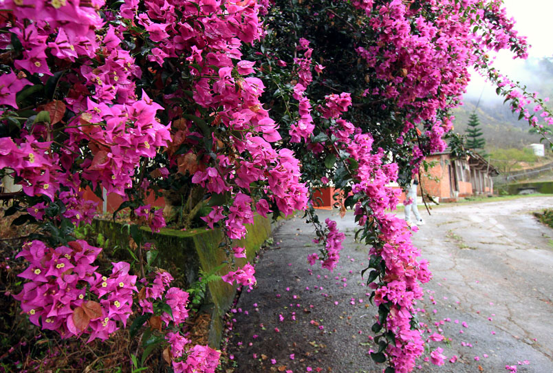 賴家古厝前的九重葛正熱情地綻放。