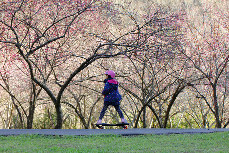 白色、粉紅、桃紅色與山色相映紅,各領風騷;梅園內百花齊