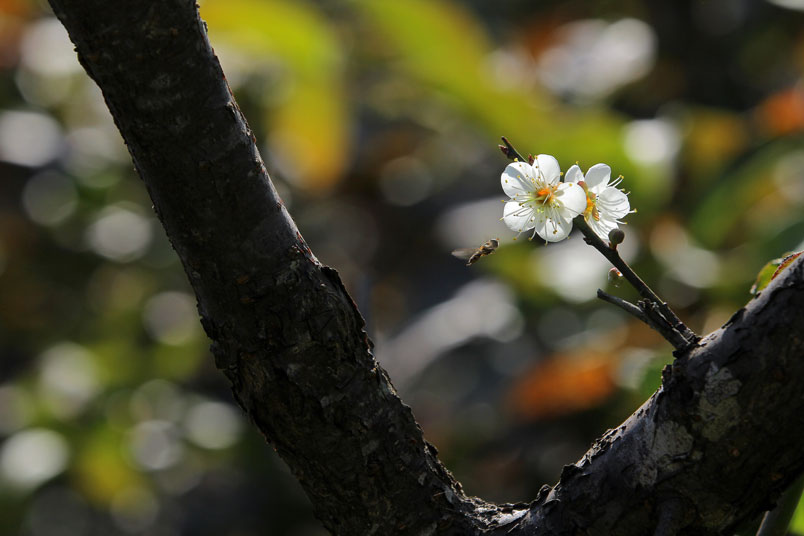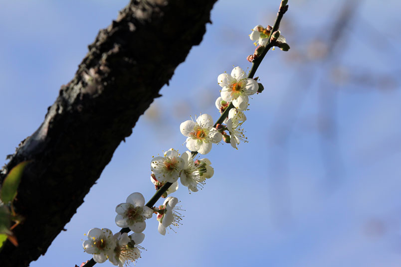 角板山目前除了欣賞白梅,山櫻花也初綻枝頭,還有殘楓相輝映