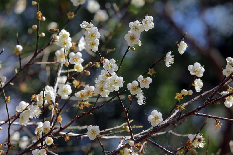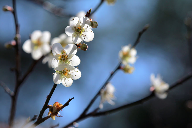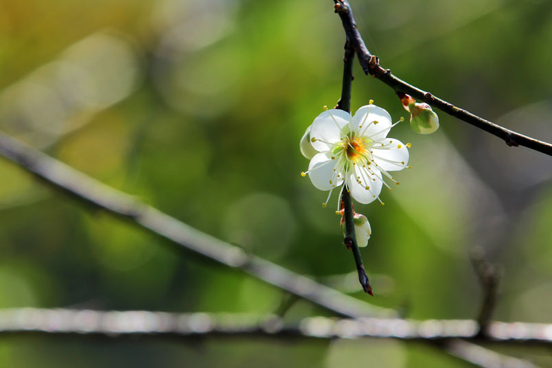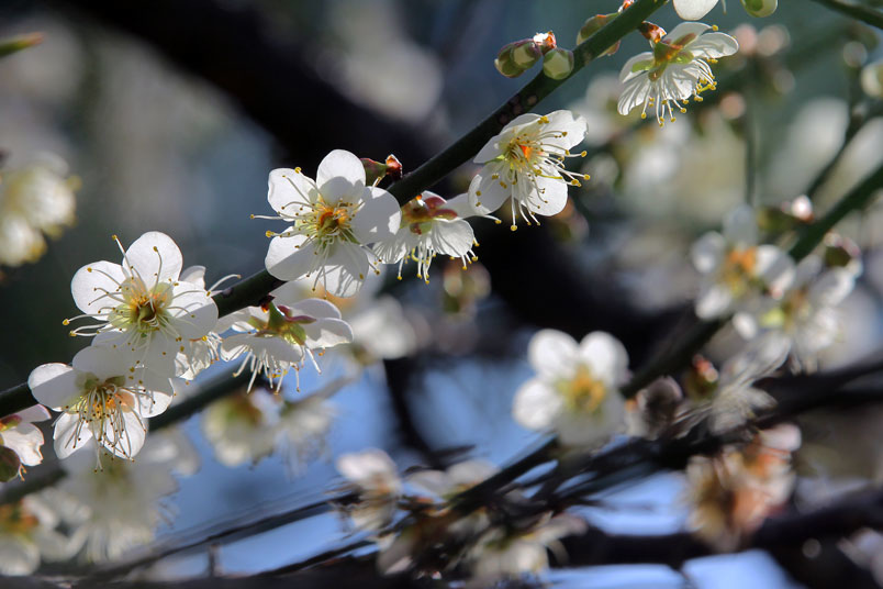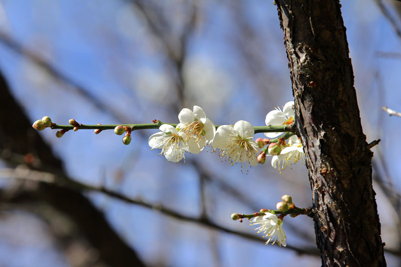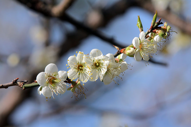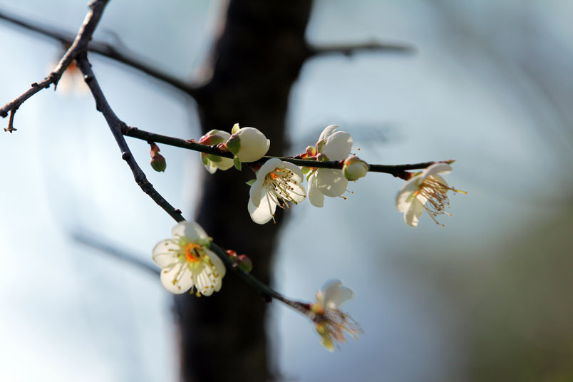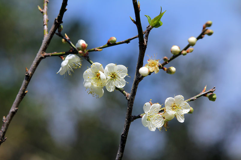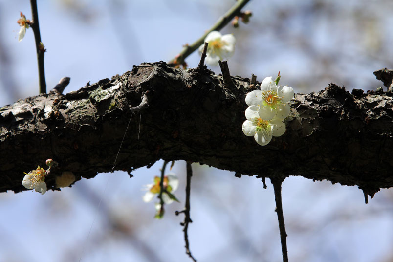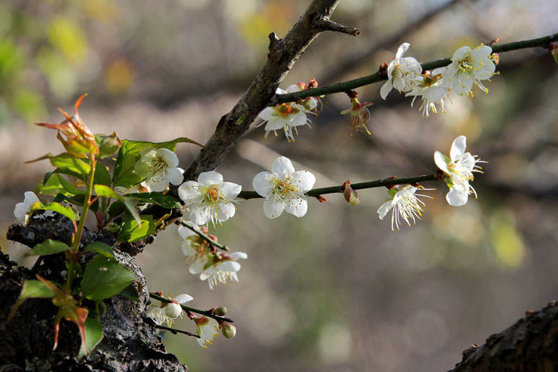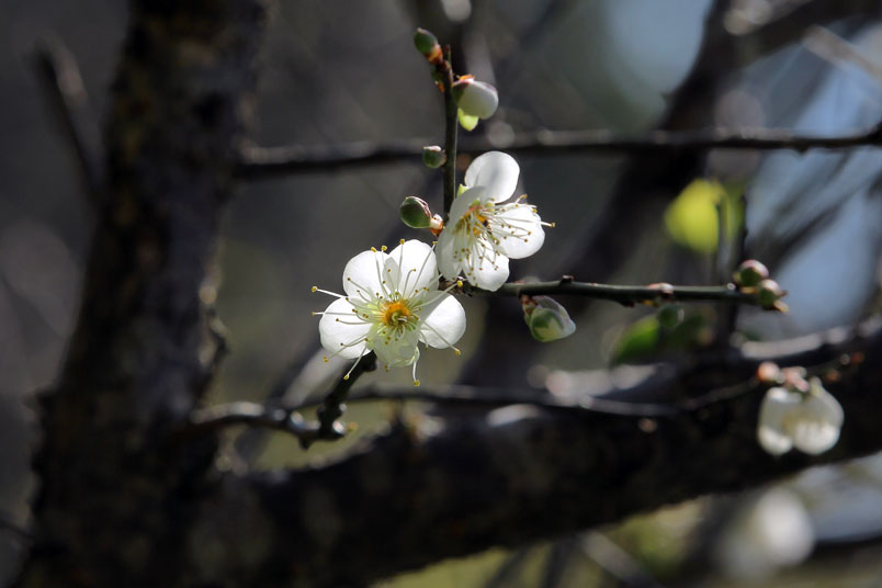 梅花爲落葉小喬木,高可達10米,樹幹灰褐色,小枝細長綠色無