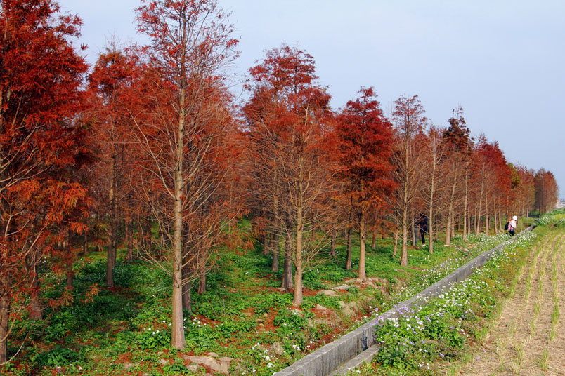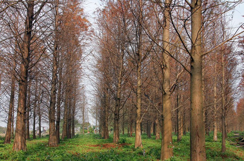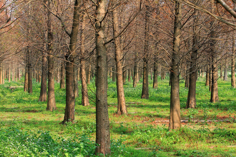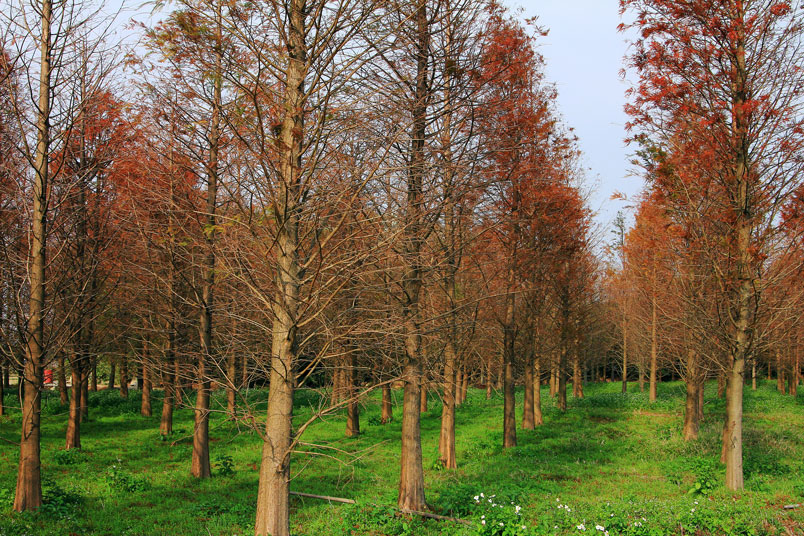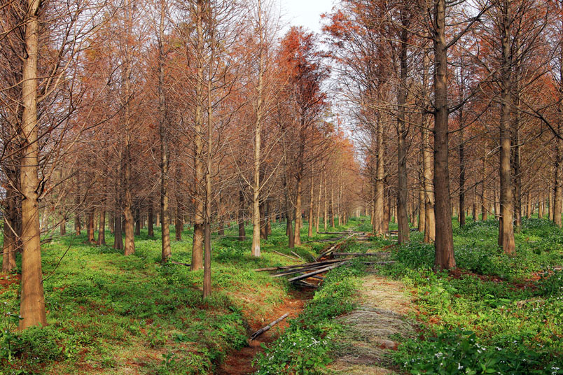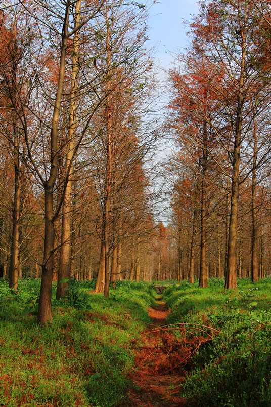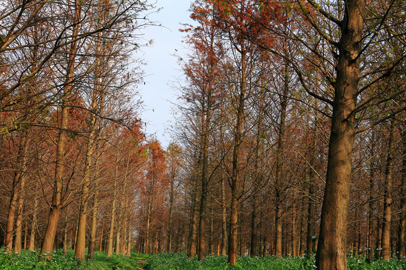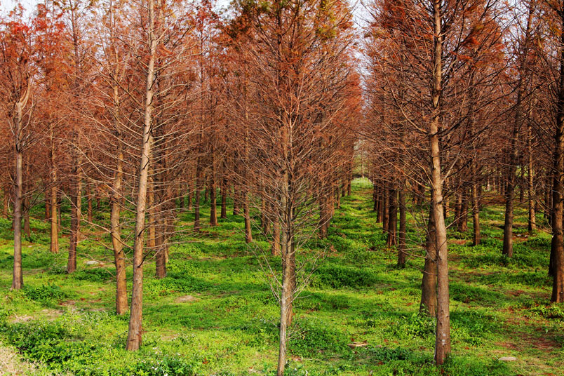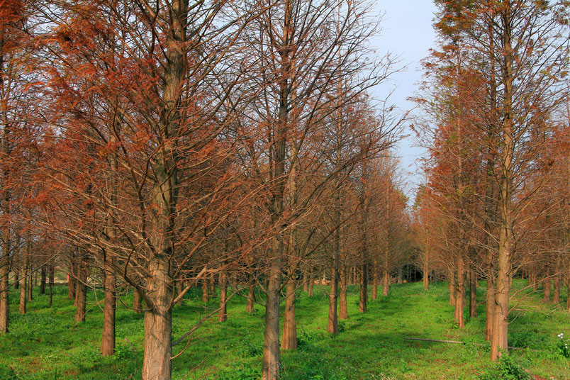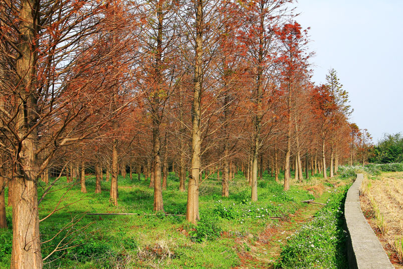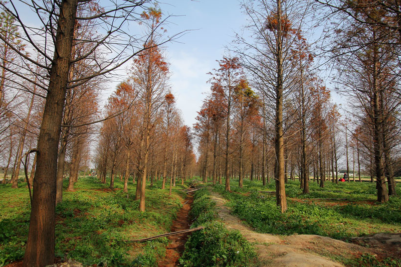 羽松林也不遑多讓。整齊而密集的落羽松,種植在綠草鋪成