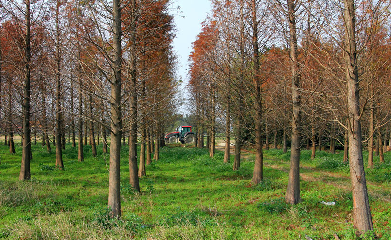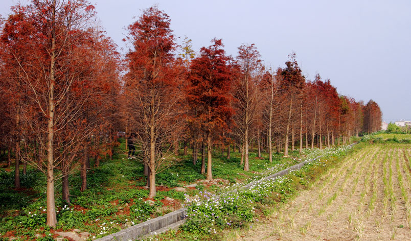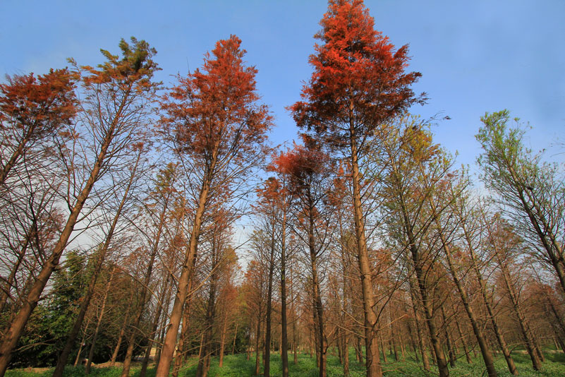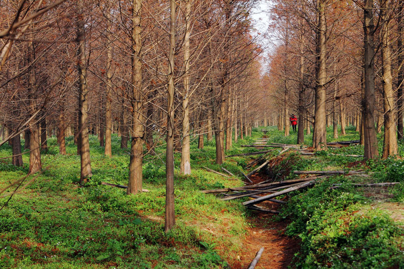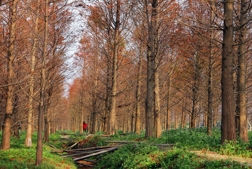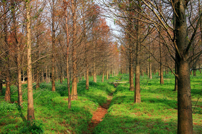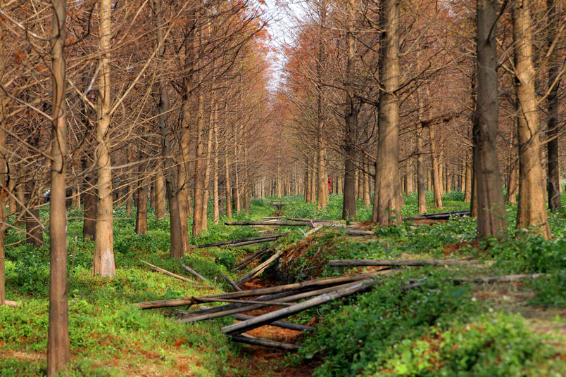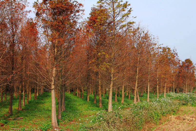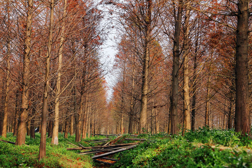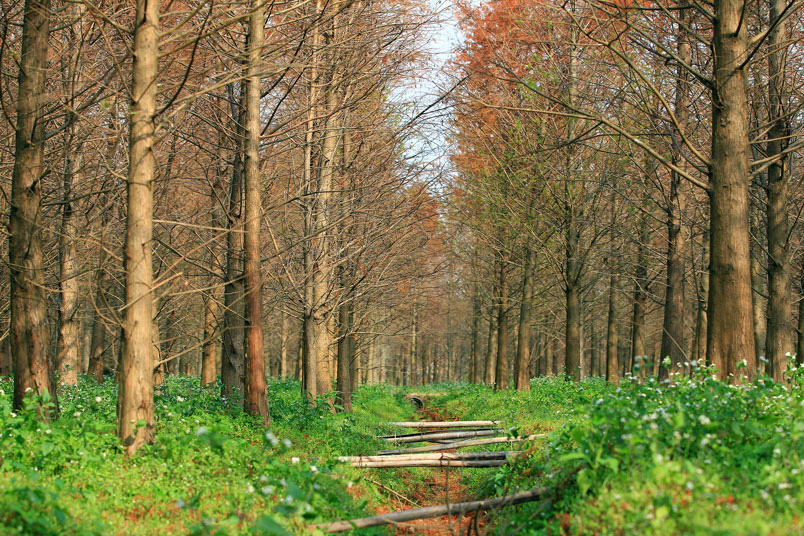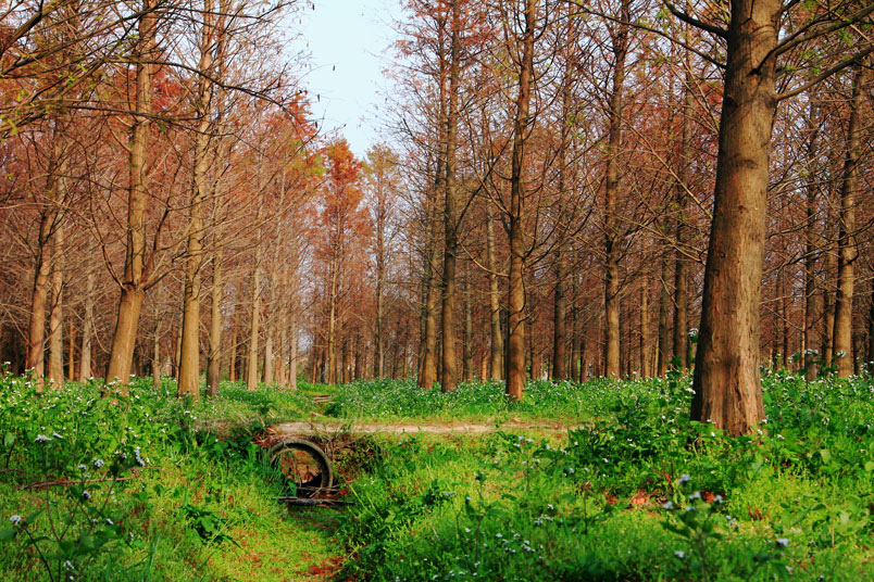 羽松林也不遑多讓。整齊而密集的落羽松,種植在綠草鋪成