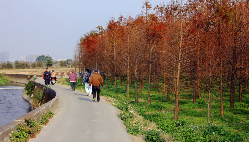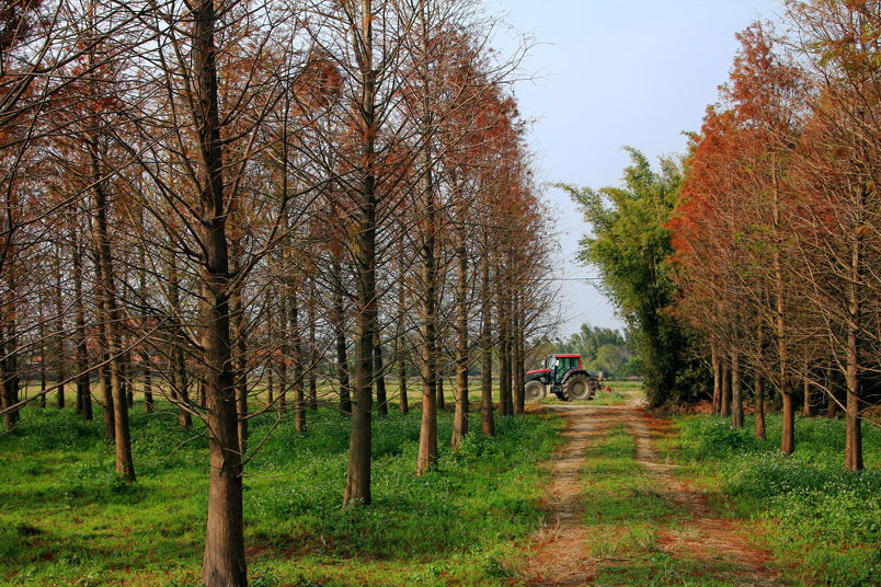 落羽松森林旁邊是稻田,鄉間小路無法會車,來遊賞的朋友