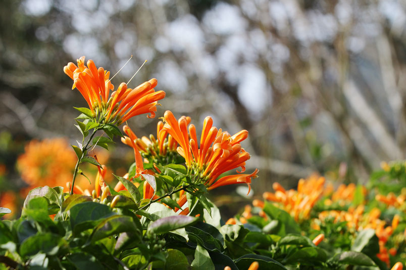 花色為明亮的橘黃色,花型呈長筒狀,頂端四裂,裂片會反
