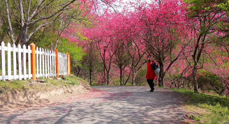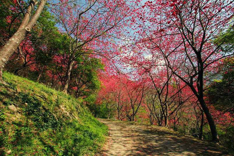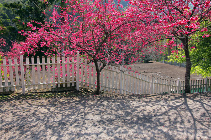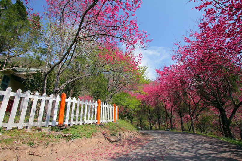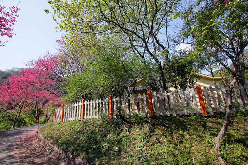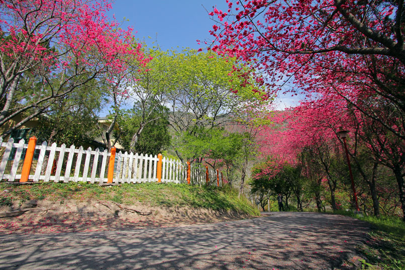 藍藍的天空、白色的宿舍小圍籬、幽靜小徑、路旁盛開的櫻花,