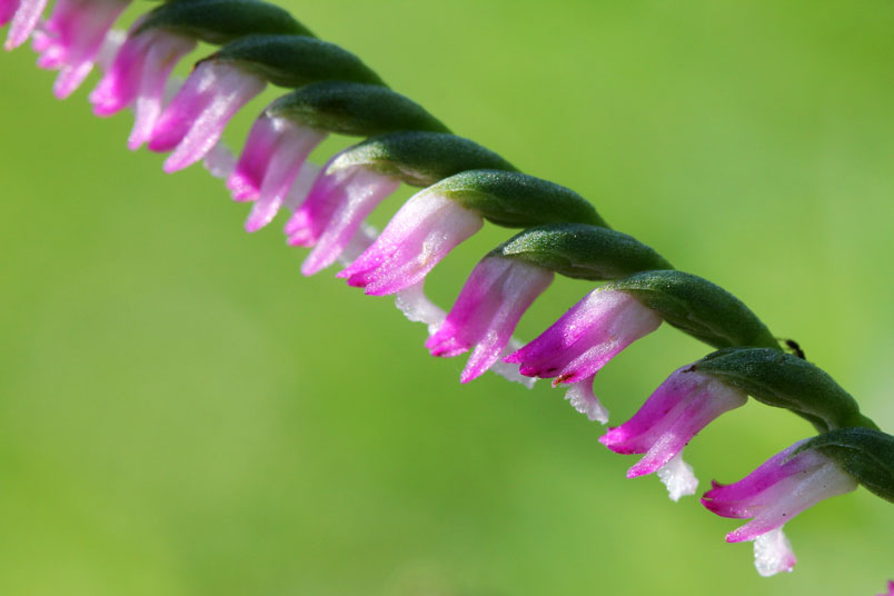 露出小巧粉嫩的花莖,小花在花莖上以螺旋狀排列,也因為特