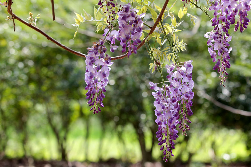 木香咖啡的紫藤,垂掛飄揚成一片紫色花海,嬌豔的花朵隨風
