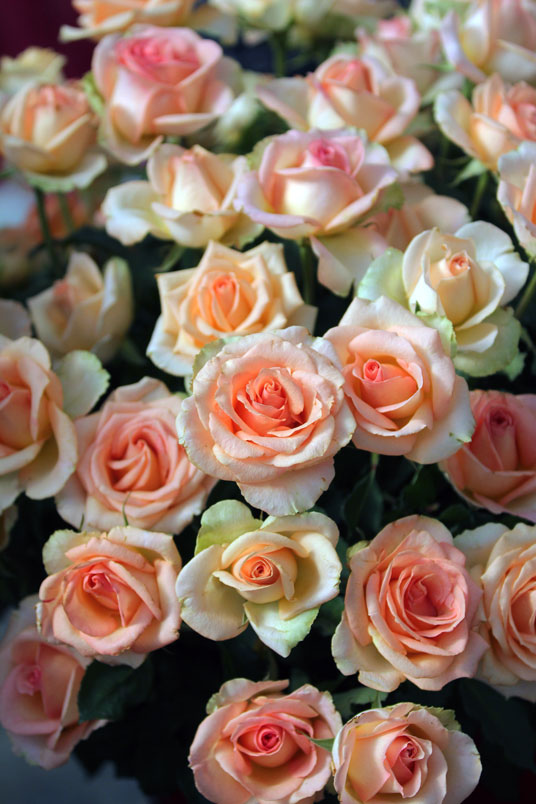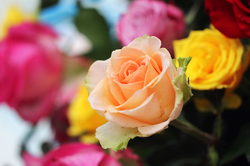 一整片紅、橘、白、黃、粉紅等色彩繽紛的玫瑰花,隨著高溫的