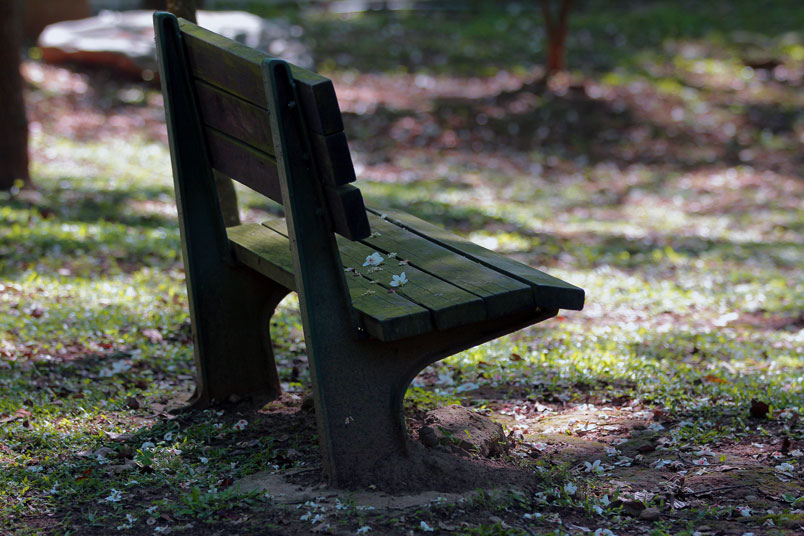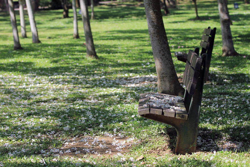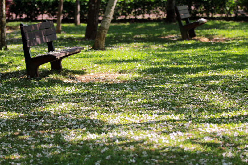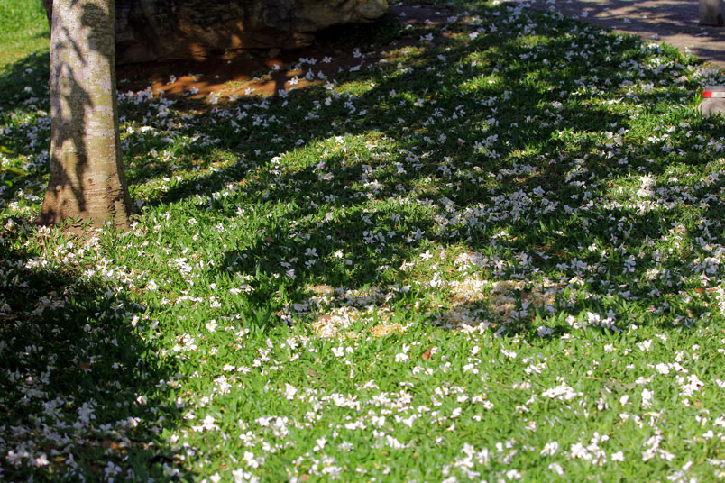 地上,遊客隨手拾起落花,在草地上排列成愛心或自己的名字