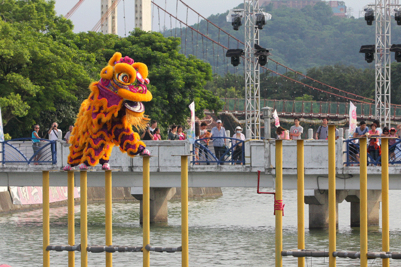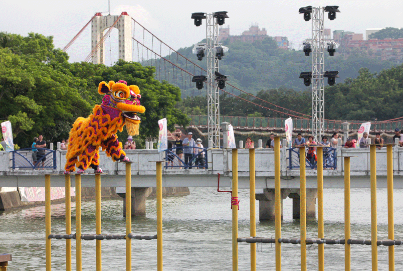 醒獅水上跳樁,危險度相當高,獅子必須具備克服萬難的勇氣,