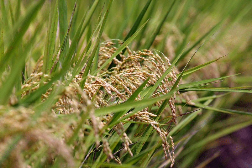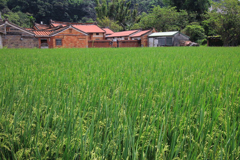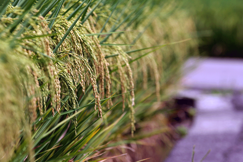 紅搖䆉稏纍纍立,碧染袈裟穗穗低。