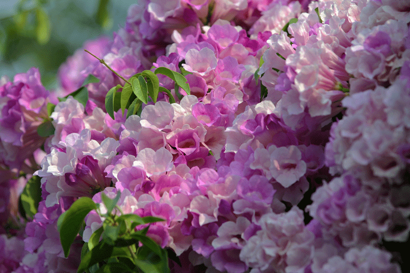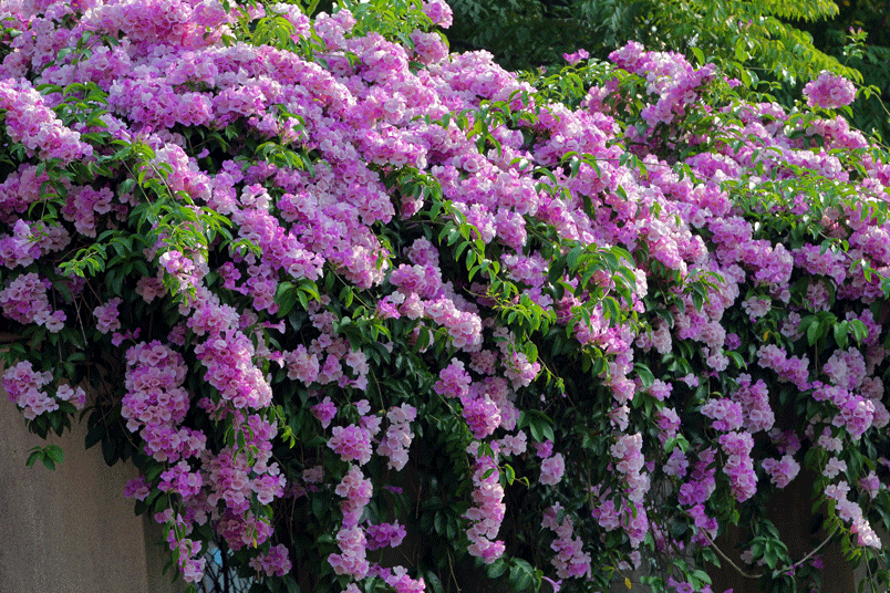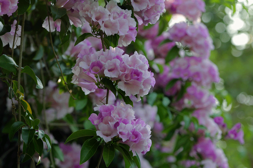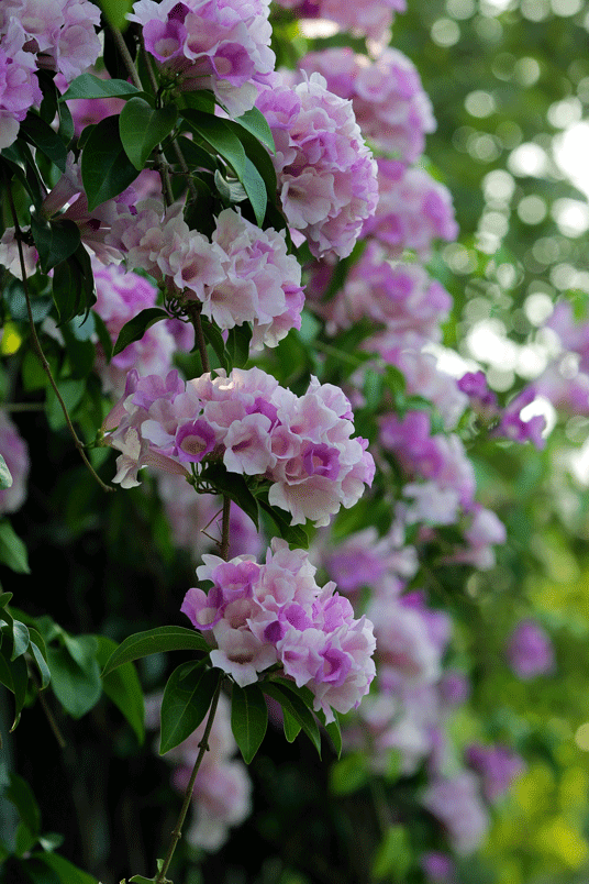 蒜香藤盛開時,彷彿垂掛著團團的粉彩繡球,是極具觀賞價